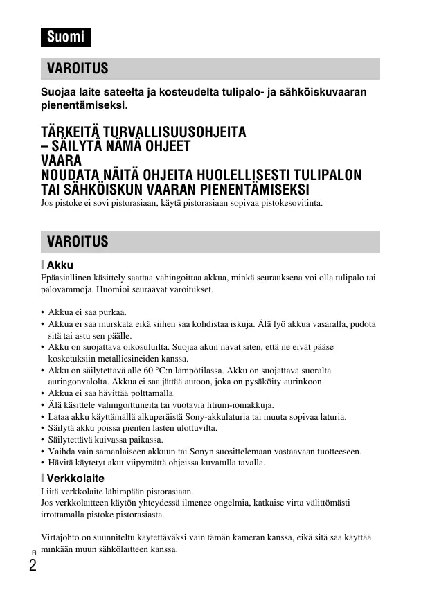 Epaasialinen käsitelly saattaa vahingoittaa akkua, minkä seurauktena voi olla tulipalo tai palovammoja. Huomioi seuraavat varoitukset.