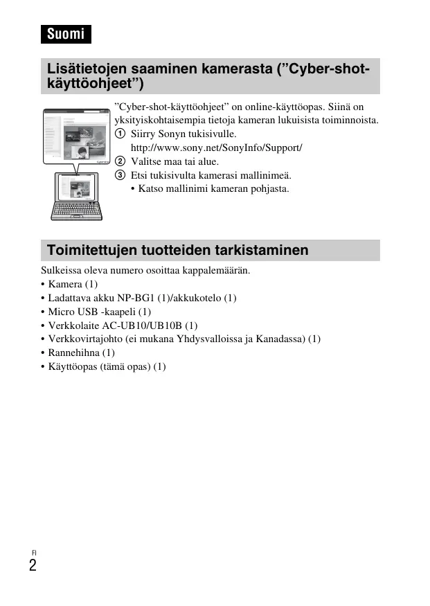 Suomi Lisätietojen saaminen kamerasta (”Cyber-shotkäyttöohjeet”) ”Cyber-shot-käyttöohjeet” on online-käyttöopas. Siinä on yksityiskohtaisempia tietoja kameran lukuisista toiminnoista. 1 Siirry Sonyn tukisivulle. http://www.sony.net/SonyInfo/Support/ 2 Valitse maa tai alue. 3 Etsi tukisivulta kamerasi mallinimeä.