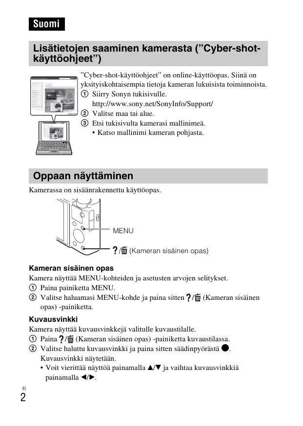 (Kameran sisäinen opas) Kameran sisäinen opas Kamera näyttää MENU-kohteiden ja asetusten arvojen selitykset. 1 Paina painiketta MENU. 2 Valitse haluamasi MENU-kohde ja paina sitten / (Kameran sisäinen opas) -painiketta. Kuvausvinkki Kamera näyttää kuvausvinkkejä valitulle kuvaustilalle. 1 Paina / (Kameran sisäinen opas) -painiketta kuvaustilassa. 2 Valitse haluttu kuvausvinkki ja paina sitten säädinpyörästä z. Kuvausvinkki näytetään.