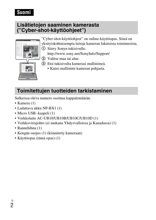 Suomi Lisätietojen saaminen kamerasta (”Cyber-shot-käyttöohjeet”) ”Cyber-shot-käyttöohjeet” on online-käyttöopas. Siinä on yksityiskohtaisempia tietoja kameran lukuisista toiminnoista. 1 Siirry Sonyn tukisivulle. http://www.sony.net/SonyInfo/Support/ 2 Valitse maa tai alue. 3 Etsi tukisivulta kamerasi mallinimeä.