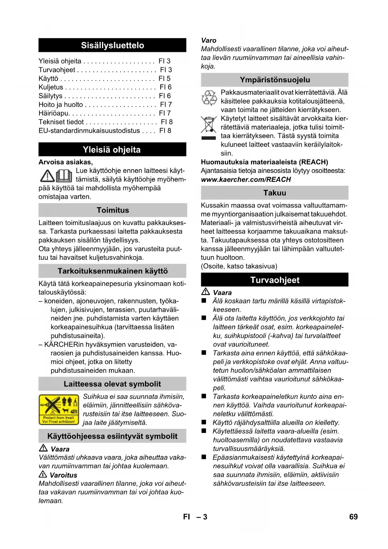 91 dB(A) 67SV– 8 Härmed försäkrar vi att nedanstående beteckna- de maskin i ändamål och konstruktion samt i den av oss levererade versionen motsvarar EU-di- rektivens tillämpliga grundläggande säkerhets- och hälsokrav. Vid ändringar på maskinen som inte har godkänts av oss blir denna överens- stämmelseförklaring ogiltig. Undertecknade agerar på order av och med full- makt från företagsledningen. Dokumentationsbefullmäktigad: S. Reiser Alfred Kärcher GmbH & Co. KG Alfred-Kärcher-Str. 28 - 40 71364 Winnenden (Germany) Tel.: +49 7195 14-0 Fax: +49 7195 14-2212 Försäkran om EU- överensstämmelse Produkt: Högtryckstvätt Typ: 1.673-xxx Tillämpliga EU-direktiv 2006/42/EG (+2009/127/EG) 2004/108/EG 2000/14/EG 2011/65/EG Tillämpade harmoniserade normer EN 50581 EN 55014–1: 2006+A1: 2009+A2: 2011 EN 55014–2: 1997+A1: 2001+A2: 2008 EN 60335–1 EN 60335–2–79 EN 61000–3–2: 2006+A1: 2009+A2: 2009 EN 61000–3–3: 2008 EN 62233: 2008 Tillämpad metod för överensstämmelsevär- dering 2000/14/EG: Bilaga V Ljudeffektsnivå dB(A) Upmätt: 89 Garanterad: 91 Winnenden, 2012/11/01 CEO Head of Approbation 68 SV– 3 Arvoisa asiakas, Lue käyttöohje ennen laitteesi käyt- tämistä, säilytä käyttöohje myöhem- pää käyttöä tai mahdollista myöhempää omistajaa varten. Laitteen toimituslaajuus on kuvattu pakkaukses- sa. Tarkasta purkaessasi laitetta pakkauksesta pakkauksen sisällön täydellisyys. Ota yhteys jälleenmyyjään, jos varusteita puut- tuu tai havaitset kuljetusvahinkoja. Käytä tätä korkeapainepesuria yksinomaan koti- talouskäytössä: – koneiden, ajoneuvojen, rakennusten, työka- lujen, julkisivujen, terassien, puutarhaväli- neiden jne. puhdistamista varten käyttäen korkeapainesuihkua (tarvittaessa lisäten puhdistusaineita). – KÄRCHERin hyväksymien varusteiden, va- raosien ja puhdistusaineiden kanssa. Huo- mioi ohjeet, jotka on liitetty puhdistusaineiden mukaan. Suihkua ei saa suunnata ihmisiin, eläimiin, jännitteellisiin sähköva- rusteisiin tai itse laitteeseen. Suo- jaa laite jäätymiseltä. Vaara Välittömästi uhkaava vaara, joka aiheuttaa vaka- van ruumiinvamman tai johtaa kuolemaan. 몇 Varoitus Mahdollisesti vaarallinen tilanne, joka voi aiheut- taa vakavan ruumiinvamman tai voi johtaa kuo- lemaan. Varo Mahdollisesti vaarallinen tilanne, joka voi aiheut- taa lievän ruumiinvamman tai aineellisia vahin- koja. Pakkausmateriaalit ovat kierrätettäviä. Älä käsittelee pakkauksia kotitalousjätteenä, vaan toimita ne jätteiden kierrätykseen. Käytetyt laitteet sisältävät arvokkaita kier- rätettäviä materiaaleja, jotka tulisi toimit- taa kierrätykseen. Tästä syystä toimita kuluneet laitteet vastaaviin keräilylaitok- siin. Huomautuksia materiaaleista (REACH) Ajantasaisia tietoja ainesosista löytyy osoitteesta: www.kaercher.com/REACH Kussakin maassa ovat voimassa valtuuttamam- me myyntiorganisaation julkaisemat takuuehdot. Materiaali- ja valmistusvirheistä aiheutuvat vir- heet laitteessa korjaamme takuuaikana maksut- ta. Takuutapauksessa ota yhteys ostotositteen kanssa jälleenmyyjään tai lähimpään valtuutet- tuun huoltoon. (Osoite, katso takasivua) Vaara Älä koskaan tartu märillä käsillä virtapistok- keeseen. Älä ota laitetta käyttöön, jos verkkojohto tai laitteen tärkeät osat, esim. korkeapainelet- ku, suihkupistooli (-kahva) tai turvalaitteet ovat vaurioituneet. Tarkasta aina ennen käyttöä, että sähkökaa- peli ja verkkopistoke ovat ehjät. Anna valtuu- tetun huollon/sähköalan ammattilaisen välittömästi vaihtaa vaurioitunut sähkökaa- peli. Tarkasta korkeapaineletkun kunto aina en- nen käyttöä. Vaihda vaurioitunut korkeapai- neletku välittömästi. Käyttö räjähdysalttiilla alueilla on kielletty. Käytettäessä laitetta vaara-alueilla (esim. huoltoasemilla) on noudatettava vastaavia turvallisuusmääräyksiä. Epäasianmukaisesti käytettyinä korkeapai- nesuihkut voivat olla vaarallisia. Suihkua ei saa suunnata ihmisiin, eläimiin, aktiivisiin sähkövarusteisiin tai itse laitteeseen. Sisällysluettelo Yleisiä ohjeita . . . . . . . . . . . . . . . . . . . FI 3 Turvaohjeet . . . . . . . . . . . . . . . . . . . . . FI 3 Käyttö . . . . . . . . . . . . . . . . . . . . . . . . . FI 5 Kuljetus . . . . . . . . . . . . . . . . . . . . . . . . FI 6 Säilytys . . . . . . . . . . . . . . . . . . . . . . . . FI 6 Hoito ja huolto . . . . . . . . . . . . . . . . . . . FI 7 Häiriöapu. . . . . . . . . . . . . . . . . . . . . . . FI 7 Tekniset tiedot . . . . . . . . . . . . . . . . . . . FI 8 EU-standardinmukaisuustodistus . . . . FI 8 Yleisiä ohjeita Toimitus Tarkoituksenmukainen käyttö Laitteessa olevat symbolit Käyttöohjeessa esiintyvät symbolit Ympäristönsuojelu Takuu Turvaohjeet 69FI– 4 Älä suuntaa korkeapainesuihkua muihin ih- misiin tai itseesi vaatteiden tai kenkien puh- distamiseksi. Älä ruiskuta esineitä, jotka sisältävät tervey- delle haitallisia aineita (esim. asbesti). Korkeapainesuihku voi vaurioittaa ajoneu- von renkaita/renkaiden venttiilejä, jolloin ne saattavat puhjeta. Ensimmäinen merkki siitä on renkaan värin muuttuminen. Vaurioitu- neet ajoneuvon renkaat/ renkaiden venttiilit ovat hengenvaarallisia. Pidä puhdistuksessa vähintään 30 cm suihkutusetäisyys! Räjähdysvaara! Älä suihkuta mitään palavia nesteitä. Älä koskaan ime liuotinpitoisia nesteitä tai lai- mentamattomia happoja tai liuottimia! Niihin kuuluvat esim. bensiini, värinohennusaineet tai polttoöljy. Ruiskutussumu on erittäin herkästi syttyvää, helposti räjähtävää ja myrkyllistä. Älä käytä asetonia, laimentamattomia happoja eikä liuottimia, koska ne syövyttävät laitteessa käytettyjä materiaaleja. 몇 Varoitus Verkkojohdon ja jatkojohdon liittimen on oltava vesitiiviitä, eivätkä ne saa maata vedessä. Tarkoitukseen sopimattomat jatkojohdot voi- vat olla vaarallisia. Käytä ulkona vain tarkoi- tukseen hyväksyttyjä ja vastaavasti merkit