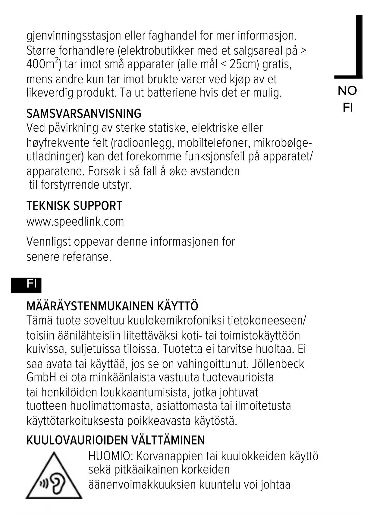 Voimakkaat staattiset, sähköiset tai korkeataajuuksiset kentät (radiolaitteistot, matkapuhelimet, mikroaaltopurkaukset) voivat vaikuttaa laitteen (laitteiden) toimintaan. Laite on silloin yritettävä siirtää kauemmas häiriön aiheuttavista laitteista. TEKNINEN TUKI www.speedlink.com Säilytä nämä tiedot myöhempää käyttöä varten.