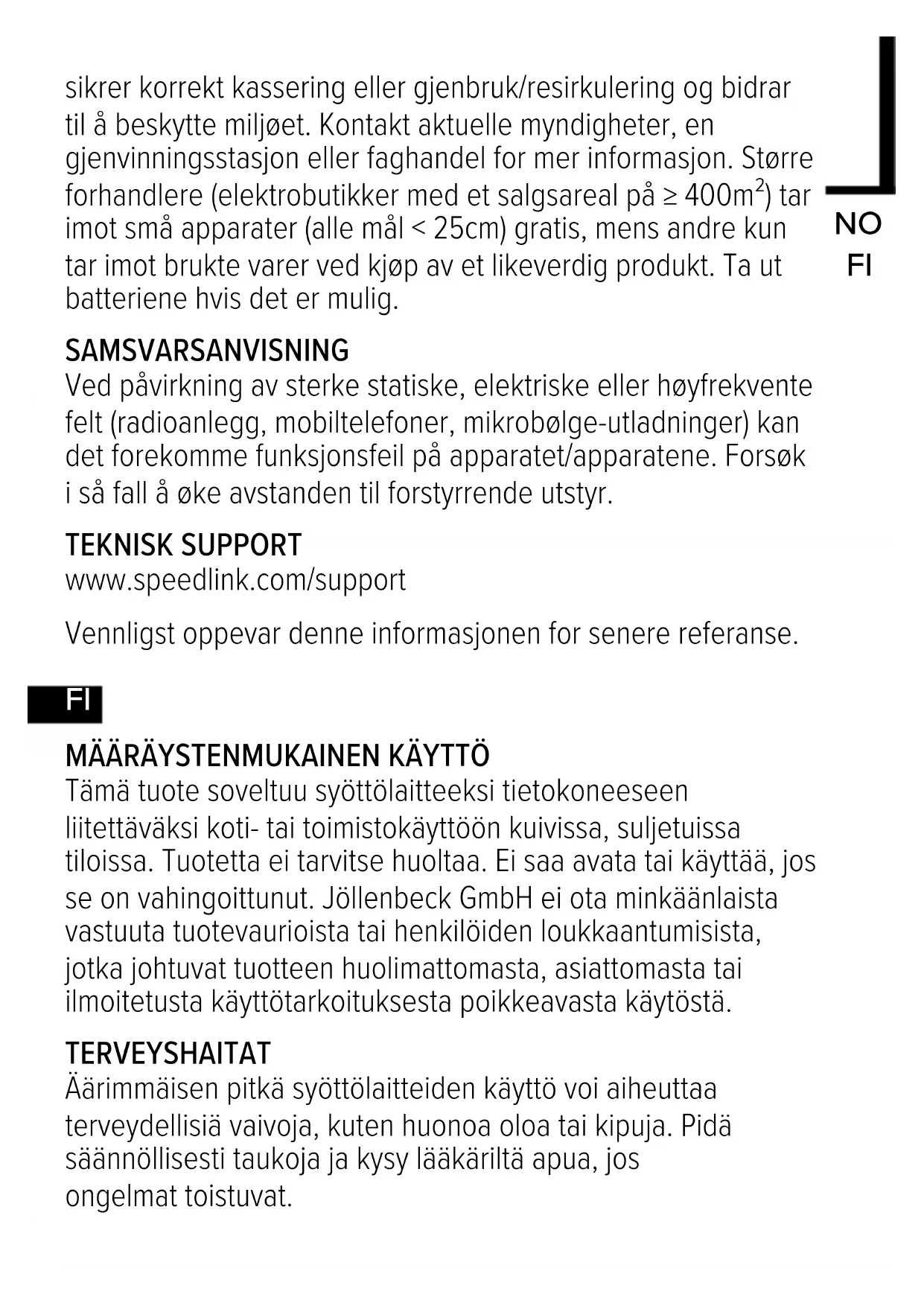 Voimakkaat staattiset, sähköiset tai korkeataajuuksiset kentät (radiolaitteistot, matkapuhelimet, mikroaaltopurkaukset) voivat vaikuttaa laitteen (laitteiden) toimintaan. Laite on silloin yritettävä siirtää kauemmas häiriön aiheuttavista laitteista. TEKNINEN TUKI www.speedlink.com/support Säilytä nämä tiedot myöhempää käyttöä varten.