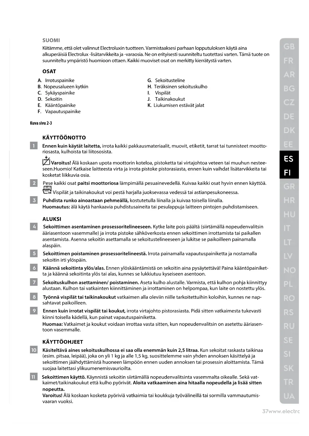 SUOMI Kiitämme, että olet valinnut Electroluxin tuotteen. Varmistaaksesi parhaan lopputuloksen käytä aina alkuperäisiä Electrolux -lisätarvikkeita ja -varaosia. Ne on erityisesti suunniteltu tuotettasi varten. Tämä tuote on suunniteltu ympäristö huomioon ottaen. Kaikki muoviset osat on merkitty kierrätystä varten. OSAT A. Irrotuspainike B. Nopeusalueen kytkin C. Sykäyspainike D. Sekoitin E. Kääntöpainike F. Vapautuspainike G. Sekoitusteline H. Teräksinen sekoituskulho