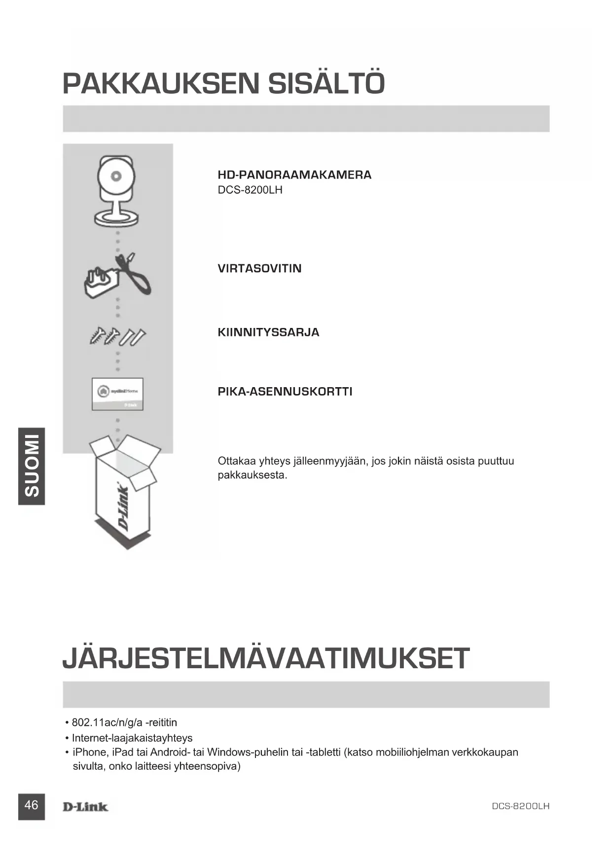 HD-PANORAAMAKAMERA DCS-8200LH KIINNITYSSARJA VIRTASOVITIN Ottakaa yhteys jälleenmyyjään, jos jokin näistä osista puuttuu pakkauksesta. PIKA-ASENNUSKORTTI