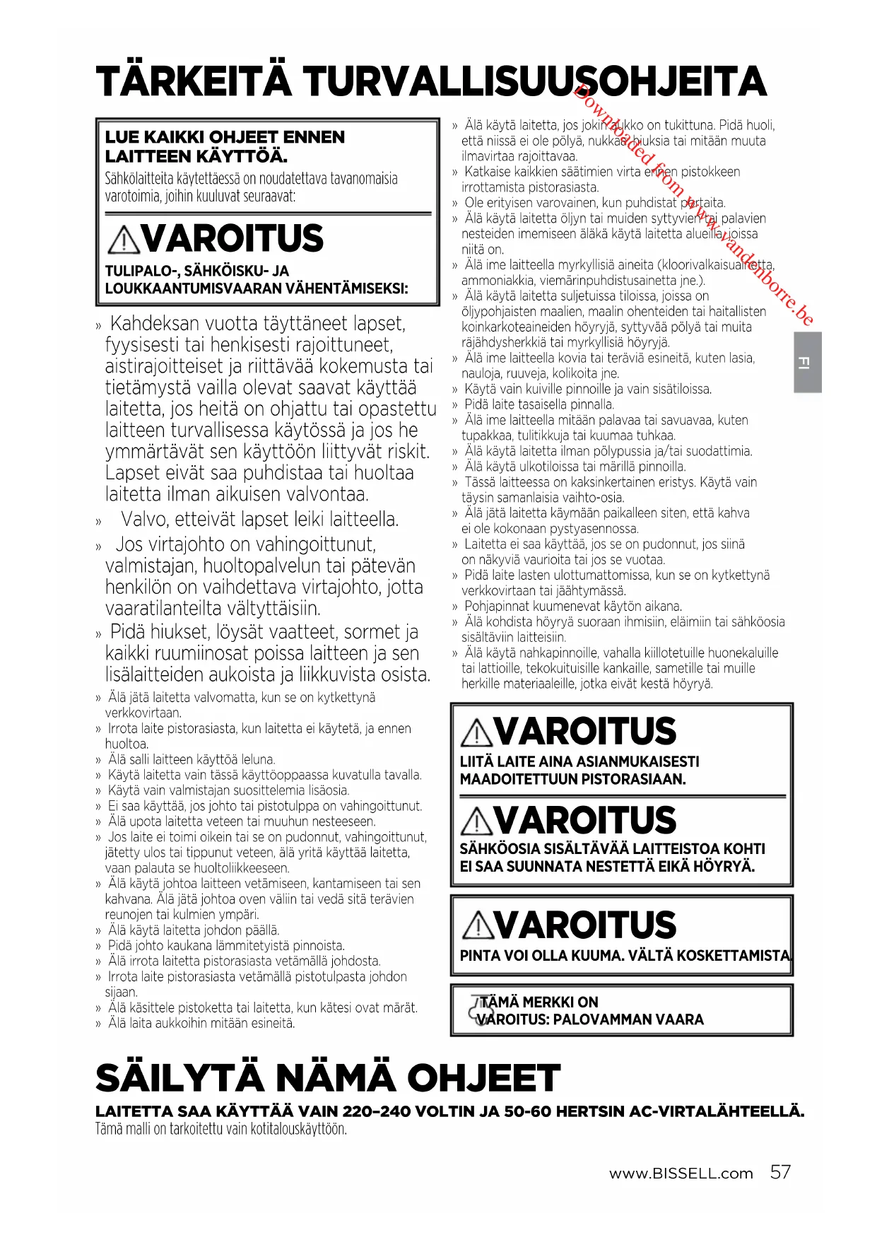 LAITETTA SAA KÄYTTÄÄ VAIN 220–240VOLTIN JA 50-60 HERTSIN AC-VIRTALÄHTEELLÄ. Tämä malli on tarkoitettu vain kotitalouskäyttöön. Downloaded from www.vandenborre.beFI www.BISSELL.com