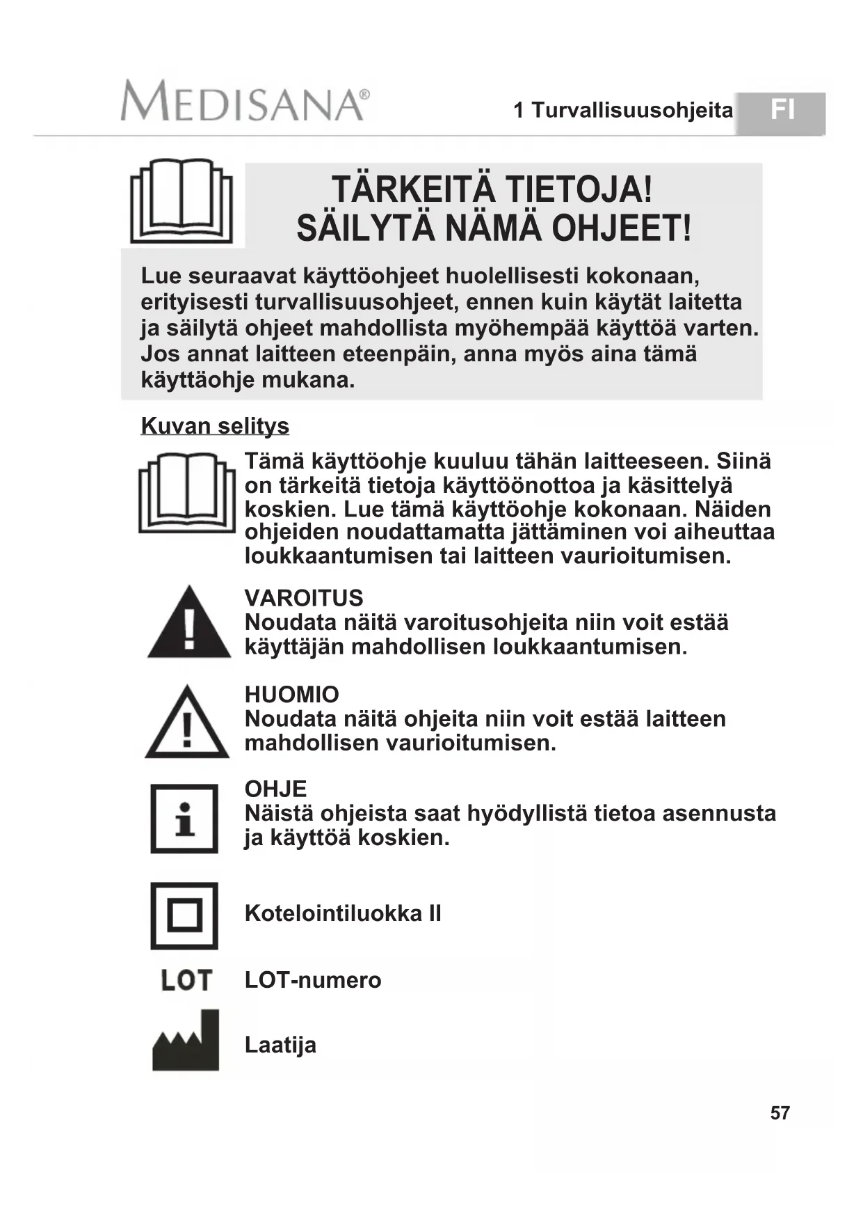 5 Garantie 56FI 1 Turvallisuusohjeita TÄRKEITÄ TIETOJA! SÄILYTÄ NÄMÄ OHJEET! Tämä käyttöohje kuuluu tähän laitteeseen. Siinä on tärkeitä tietoja käyttöönottoa ja käsittelyä koskien. Lue tämä käyttöohje kokonaan. Näiden ohjeiden noudattamatta jättäminen voi aiheuttaa loukkaantumisen tai laitteen vaurioitumisen. VAROITUS Noudata näitä varoitusohjeita niin voit estää käyttäjän mahdollisen loukkaantumisen. HUOMIO Noudata näitä ohjeita niin voit estää laitteen mahdollisen vaurioitumisen. OHJE Näistä ohjeista saat hyödyllistä tietoa asennusta ja käyttöä koskien. Kotelointiluokka II Kuvan selitys LOT-numero Laatija Lue seuraavat käyttöohjeet huolellisesti kokonaan, erityisesti turvallisuusohjeet, ennen kuin käytät laitetta ja säilytä ohjeet mahdollista myöhempää käyttöä varten. Jos annat laitteen eteenpäin, anna myös aina tämä käyttäohje mukana. 57• Ota huomioon, että tyyppikilvessä mainittu sähköjännite vastaa verkkovirtaasi, ennen kuin liität laitteen virransyöttöön. Pidä verkkojohto ja laite loitolla kuumuudesta, kuumista pinnoista, kosteudesta ja nesteistä. Älä ikinä koske verk- kopistoketta tai verkkokytkintä, kun ne ovat vedessä, tai märin tai kostein käsin. Älä tartu veteen pudonneeseen laitteeseen. Irrota verkkopistoke heti. Älä nosta tuotetta, jos se putoaa veteen. Irrota johto välittömästi pistorasiasta. Katkaise laitteesta virta käyttöosan painikkeiden avulla heti käytön jälkeen ja irrota verkkopistoke pistorasiasta. Irrottaaksesi laitteen sähköverkosta älä koskaan vedä verkkojohdosta, vaan aina verkkopistokkeesta! Älä kanna, vedä tai kierrä laitetta verkkojohdosta. Jos verkkojohto on vaurioitunut, sen saa vaarojen välttämi- seksi vaihtaa ainoastaan MEDISANA, valtuutettu jälleen- myyjä tai vastaava pätevä henkilö. Huomioi, ettei johto aiheuta kompastumisvaaraa. Sitä ei saa