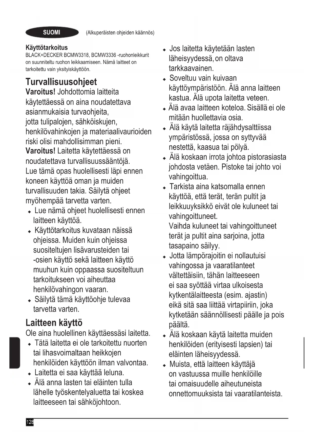 (garanteret lydeffekt) 96 dB(A) Disse produkter er endvidere i overensstemmelse med direktiv 2014/30/EU, 2011/65/EU. Kontakt Black & Decker på nedenstående adresse eller se vejledningens bagside for at få yderligere oplysninger. Undertegnede er ansvarlig for udarbejdelsen af de tekniske data og fremsætter denne erklæring på vegne af Black & Decker. Becky Cotsworth Direktør – Outdoor Products Group Black & Decker Europe, 270 Bath Road, Slough, Berkshire, SL1 4DX Storbritannien 11/10/2019 Garanti Black & Decker er overbevist om den gode kvalitet af sine produkter og giver forbrugerne en garanti på 24 måneder fra købsdatoen. Garantien er et tillæg til forbrugerens lovmæssige rettigheder og påvirker ikke disse. Garantien er gyldig inden for medlemsstaterne af Den Europæiske Union og Det Europæiske Frihandelsområde. Når du gør krav på garantien, skal kravet være i overensstemmelse med Black&Decker vilkår og betingelser, og du skal indsende dokumentation for købet til sælgeren eller til en autoriseret reparatør. Vilkår og betingelser for Black & Decker 2 års garanti og det nærmeste autoriserede serviceværksted ndes på internettet på www.2helpU.com, eller du kan kontakte dit lokale Black & Decker kontor på den adresse, der er angivet i denne vejledning. Besøg venligst vores websted www.blackanddecker.co.uk for at registrere dit nye Black & Decker produkt og modtage opdateringer om nye produkter og specielle tilbud.128 (Alkuperäisten ohjeiden käännös) SUOMI Käyttötarkoitus BLACK+DECKER BCMW3318, BCMW3336 -ruohonleikkurit on suunniteltu ruohon leikkaamiseen. Nämä laitteet on tarkoitettu vain yksityiskäyttöön. Turvallisuusohjeet Varoitus! Johdottomia laitteita käytettäessä on aina noudatettava asianmukaisia turvaohjeita, jotta tulipalojen, sähköiskujen, henkilövahinkojen ja materiaalivaurioiden riski olisi mahdollisimman pieni. Varoitus! Laitetta käytettäessä on noudatettava turvallisuussääntöjä. Lue tämä opas huolellisesti läpi ennen koneen käyttöä oman ja muiden turvallisuuden takia. Säilytä ohjeet myöhempää tarvetta varten. u Lue nämä ohjeet huolellisesti ennen laitteen käyttöä. u Käyttötarkoitus kuvataan näissä ohjeissa. Muiden kuin ohjeissa suositeltujen lisävarusteiden tai -osien käyttö sekä laitteen käyttö muuhun kuin oppaassa suositeltuun tarkoitukseen voi aiheuttaa henkilövahingon vaaran. u Säilytä tämä käyttöohje tulevaa tarvetta varten. Laitteen käyttö Ole aina huolellinen käyttäessäsi laitetta. u Tätä laitetta ei ole tarkoitettu nuorten tai lihasvoimaltaan heikkojen henkilöiden käyttöön ilman valvontaa. u Laitetta ei saa käyttää leluna.u Älä anna lasten tai eläinten tulla lähelle työskentelyaluetta tai koskea laitteeseen tai sähköjohtoon. u Jos laitetta käytetään lasten läheisyydessä, on oltava tarkkaavainen. u Soveltuu vain kuivaan käyttöympäristöön. Älä anna laitteen kastua. Älä upota laitetta veteen. u Älä avaa laitteen koteloa. Sisällä ei ole mitään huollettavia osia. u Älä käytä laitetta räjähdysalttiissa ympäristössä, jossa on syttyvää nestettä, kaasua tai pölyä. u Älä koskaan irrota johtoa pistorasiasta johdosta vetäen. Pistoke tai johto voi vahingoittua. u Tarkista aina katsomalla ennen käyttöä, että terät, terän pultit ja leikkuuyksikkö eivät ole kuluneet tai vahingoittuneet. Vaihda kuluneet tai vahingoittuneet terät ja pultit aina sarjoina, jotta tasapaino säilyy. u Jotta lämpörajoitin ei nollautuisi vahingossa ja vaaratilanteet vältettäisiin, tähän laitteeseen ei saa syöttää virtaa ulkoisesta kytkentälaitteesta (esim. ajastin) eikä sitä saa liittää virtapiiriin, joka kytketään säännöllisesti päälle ja pois päältä. u Älä koskaan käytä laitetta muiden henkilöiden (erityisesti lapsien) tai eläinten läheisyydessä. u Muista, että laitteen käyttäjä on vastuussa muille henkilöille tai omaisuudelle aiheutuneista onnettomuuksista tai vaaratilanteista.129 (Alkuperäisten ohjeiden käännös) SUOMI Ennen käyttöä u Käytä laitteen käytön aikana aina tukevia jalkineita ja pitkiä housuja. Älä käytä laitetta avojaloin tai avonaisien sandaalien kanssa. Vältä väljien tai nauhallisten vaatteiden käyttöä. u Tarkasta laitteen aiottu käyttöalue perusteellisesti ja poista kaikki esineet, joita laite voi heittää. u Tarkista aina katsomalla ennen käyttöä, että terä, terän pultti ja teräyksikkö eivät ole kuluneet tai vahingoittuneet. Vaihda kuluneet tai vahingoittuneet osat aina sarjoina, jotta tasapaino säilyy. Vaihda vahingoittuneet tai lukukelvottomat tarrat. Käytön jälkeen u Kun laitetta ei käytetä, säilytä sitä kuivassa, hyvin tuuletetussa paikassa poissa lasten ulottuvilta. u Pidä laite lasten ulottumattomissa. u Kun laitetta säilytetään tai kuljetetaan ajoneuvossa, sijoita se tavaratilaan tai kiinnitä se kunnolla, ettei se matkan aikana pääse liikkumaan. Tarkastus ja korjaus u Tarkista ennen laitteen käyttöä, ettei laitteessa ole vahingoittuneita tai viallisia osia. Tarkista osien ja kytkimien kunto sekä muut seikat, jotka voivat vaikuttaa laitteen toimintaan. u Älä käytä laitetta, jos jokin osa on vahingoittunut tai viallinen. u Korjauta tai vaihdata vaurioituneet tai vialliset osat valtuutetussa huoltoliikkeessä. u Älä yritä korjata tai vaihtaa muita kuin tässä käyttöohjeessa erikseen määriteltyjä osia. u Varo leikkuria säädettäessä, että sormesi eivät jää liikkuvien terien/osien ja kiinteästi asennettujen osien väliin. u Muista teriä huollettaessa, että vaikka virtalähde on sammutettu, terät liikkuvat edelleen. Ruohonleikkurien lisäturvaohjeet u Konetta ei saa kuljettaa virran ollessa päällä. u Pidä ruohonleikkuria työntöaisasta tukevasti molemmin käsin käytön aikana. u Jos joudut käytön aikana kallistamaan ruohonleikkuria, pidä molemmat kädet koko ajan ajoasennossa. Pidä molemmat kädet ajoasennossa niin