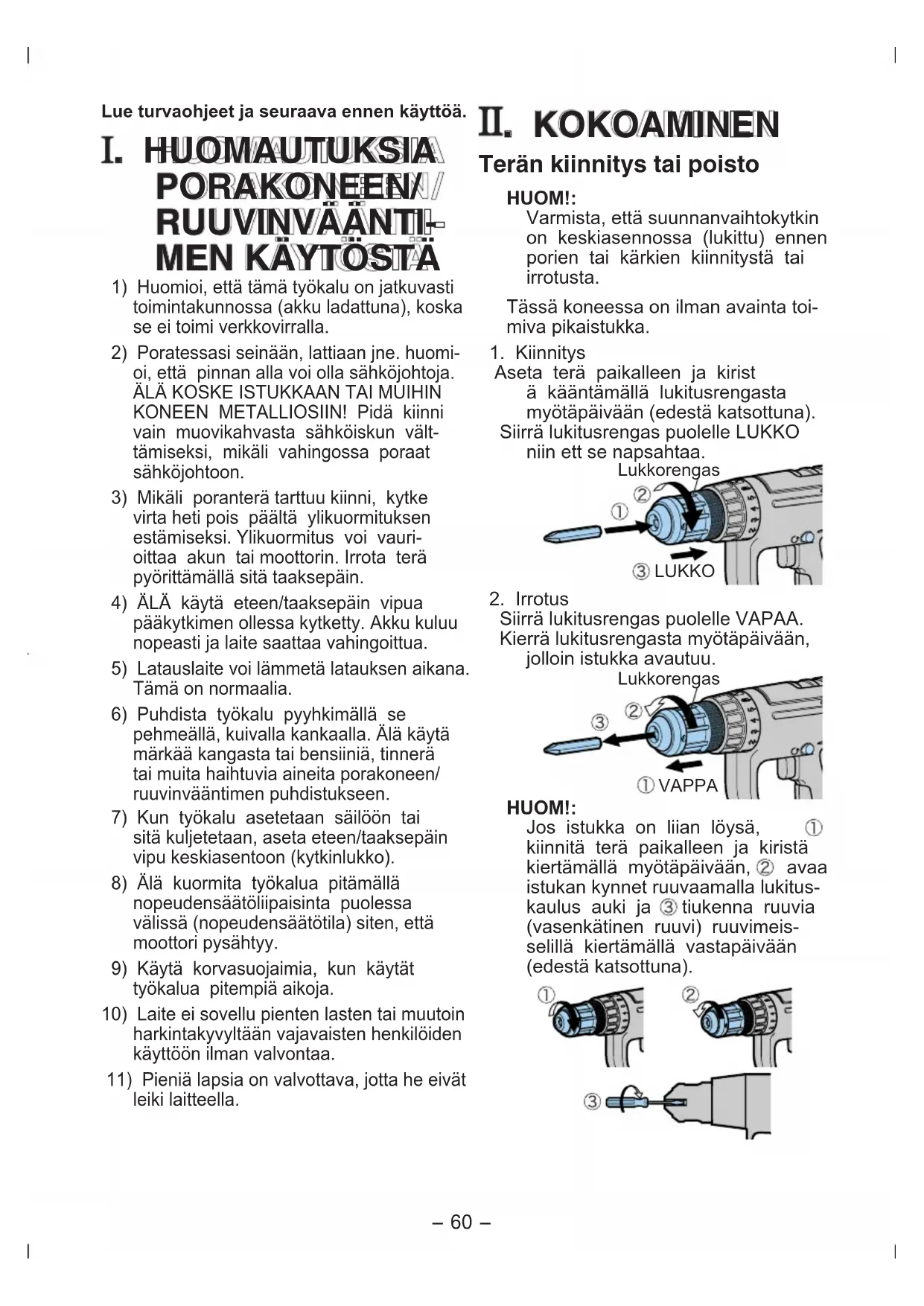 Lue turvaohjeet ja seuraava ennen käyttöä. . HUOMAUTUKSIA PORAKONEEN/ RUUVINVÄÄNTI-