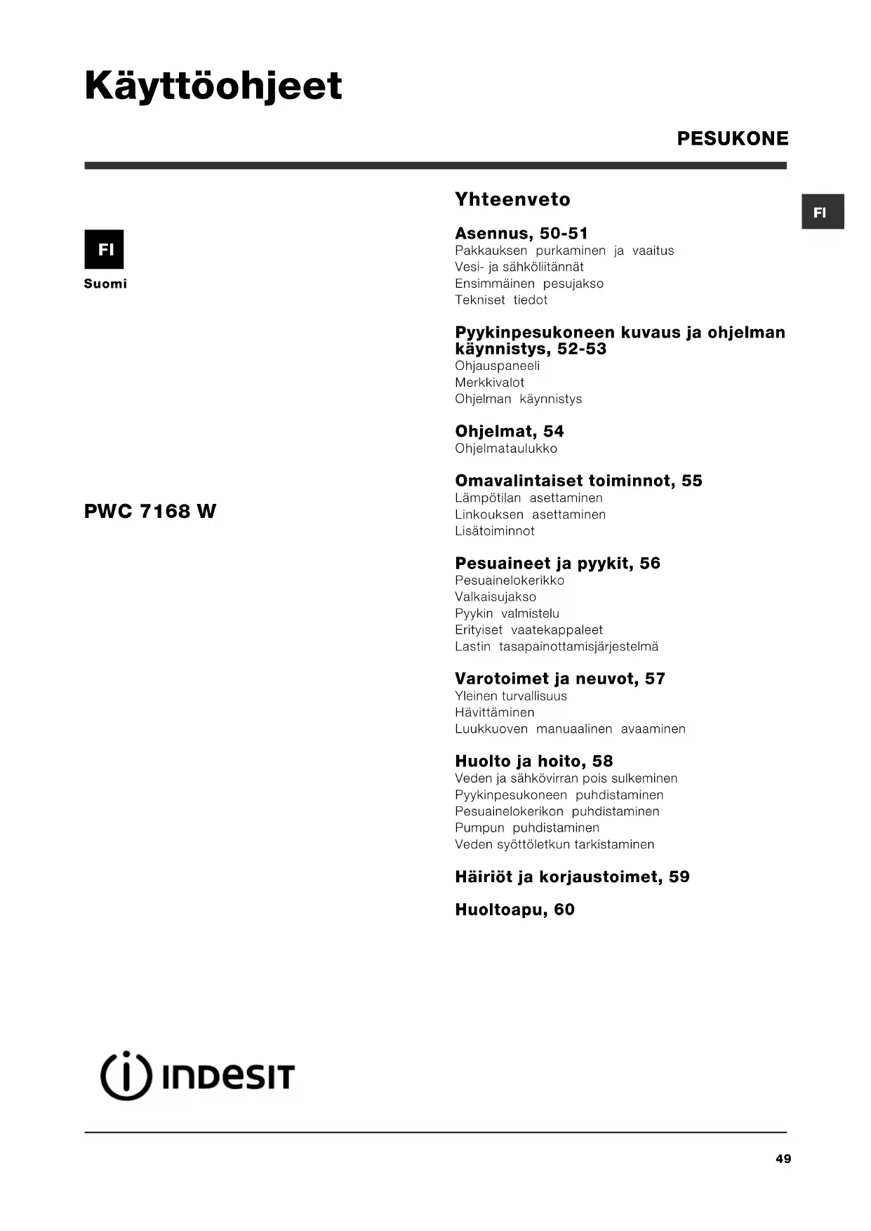 Suomi Yhteenveto Asennus, 50-51 Pakkauksen purkaminen ja vaaitus Vesi- ja sähköliitännät Ensimmäinen pesujakso Tekniset tiedot Pyykinpesukoneen kuvaus ja ohjelman käynnistys, 52-53 Ohjauspaneeli Merkkivalot Ohjelman käynnistys Ohjelmat, 54 Ohjelmataulukko Omavalintaiset toiminnot, 55 Lämpötilan asettaminen Linkouksen asettaminen Lisätoiminnot Pesuaineet ja pyykit, 56 Pesuainelokerikko Valkaisujakso Pyykin valmistelu Erityiset vaatekappaleet Lastin tasapainottamisjärjestelmä Varotoimet ja neuvot, 57 Yleinen turvallisuus Hävittäminen Luukkuoven manuaalinen avaaminen Huolto ja hoito, 58 Veden ja sähkövirran pois sulkeminen Pyykinpesukoneen puhdistaminen Pesuainelokerikon puhdistaminen Pumpun puhdistaminen Veden syöttöletkun tarkistaminen Häiriöt ja korjaustoimet, 59 Huoltoapu, 60