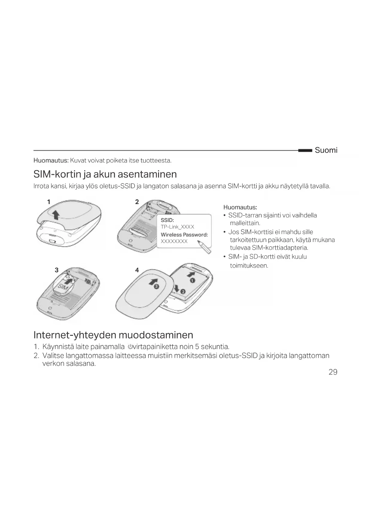 - SSID-tarran sijainti voi vaihdella malleittain.• Jos SIM-korttisi ei mahdu sille tarkoitettuun paikkaan, käytä mukana tulevaa SIM-korttiadapteria.• SIM- ja SD-kortti eivät kuulu toimitukseen.30 Suomi Huomautus: Suosittelemme, että vaihdat langattoman verkon oletusnimen ja -salasanan turvallisuussyistä. Hyviä hetkiä tuotteesi parissa! Huomautus: