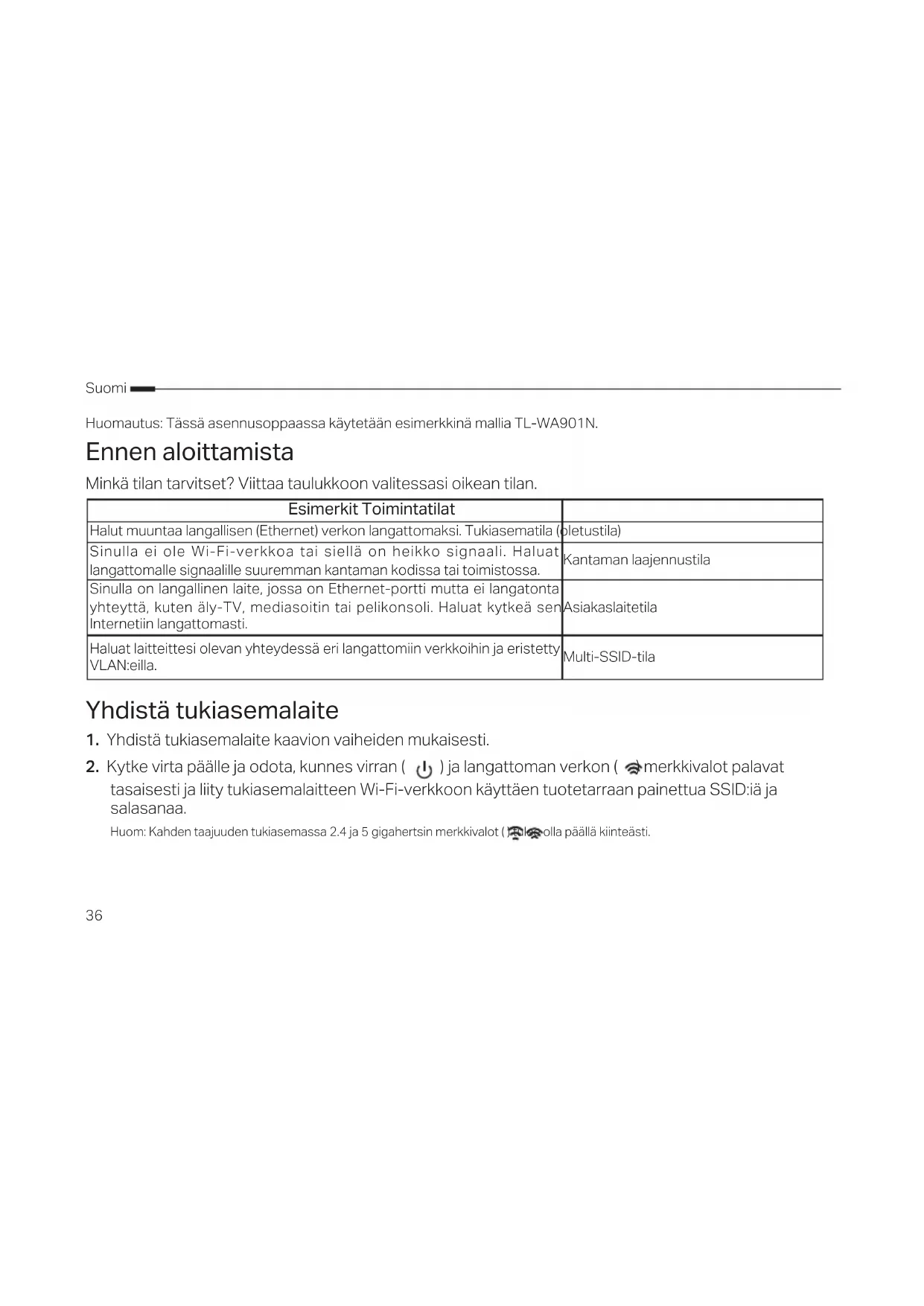 - Mova o AP para uma nova localização, de preferência afastado de dispositivos Bluetooth ou outros eletrodomésticos, telefones sem os, micro-ondas, etc, por forma a minimizar as interferências.36 Suomi Huomautus: Tässä asennusoppaassa käytetään esimerkkinä mallia TL-WA901N. Ennen aloittamista Minkä tilan tarvitset? Viittaa taulukkoon valitessasi oikean tilan. Esimerkit Toimintatilat Halut muuntaa langallisen (Ethernet) verkon langattomaksi. Tukiasematila (oletustila) Sinulla ei ole Wi-Fi-verkkoa tai siellä on heikko signaali. Haluat langattomalle signaalille suuremman kantaman kodissa tai toimistossa. Kantaman laajennustila Sinulla on langallinen laite, jossa on Ethernet-portti mutta ei langatonta yhteyttä, kuten äly-TV, mediasoitin tai pelikonsoli. Haluat kytkeä sen Internetiin langattomasti. Asiakaslaitetila Haluat laitteittesi olevan yhteydessä eri langattomiin verkkoihin ja eristetty VLAN:eilla. Multi-SSID-tila Yhdistä tukiasemalaite