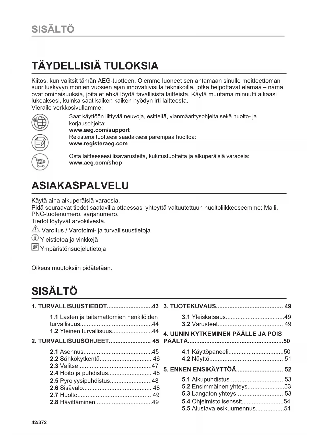 Kiitos, kun valitsit tämän AEG-tuotteen. Olemme luoneet sen antamaan sinulle moitteettoman suorituskyvyn monien vuosien ajan innovatiivisilla tekniikoilla, jotka helpottavat elämää – nämä ovat ominaisuuksia, joita et ehkä löydä tavallisista laitteista. Käytä muutama minuutti aikaasi lukeaksesi, kuinka saat kaiken kaiken hyödyn irti laitteesta. Vieraile verkkosivullamme: Saat käyttöön liittyviä neuvoja, esitteitä, vianmääritysohjeita sekä huolto- ja korjausohjeita: www.aeg.com/support Rekisteröi tuotteesi saadaksesi parempaa huoltoa: www.registeraeg.com Osta laitteeseesi lisävarusteita, kulutustuotteita ja alkuperäisiä varaosia: www.aeg.com/shop ASIAKASPALVELU Käytä aina alkuperäisiä varaosia. Pidä seuraavat tiedot saatavilla ottaessasi yhteyttä valtuutettuun huoltoliikkeeseemme: Malli, PNC-tuotenumero, sarjanumero. Tiedot löytyvät arvokilvestä. Varoitus / Varotoimi- ja turvallisuustietoja Yleistietoa ja vinkkejä Ympäristönsuojelutietoja Oikeus muutoksiin pidätetään. SISÄLTÖ