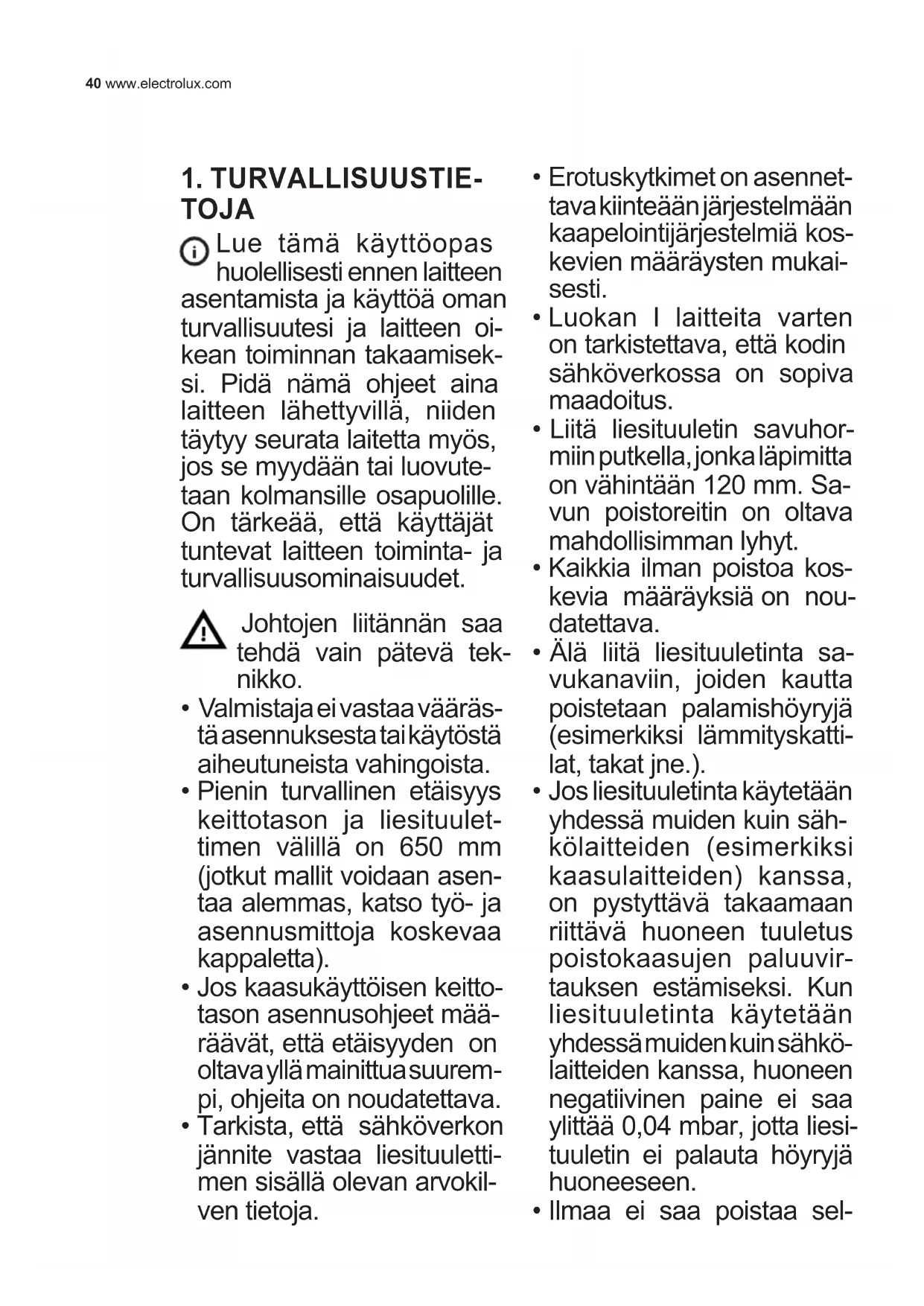 - Tilassa täytyy olla asian- mukainen tuuletus kun liesituuletinta käytetään samanaikaisesti kaasulla tai muilla polttoaineilla toimivien42 www.electrolux.com laitteiden kanssa (ei koske laitteita, jotka poistavat tilaan vain ilmaa).