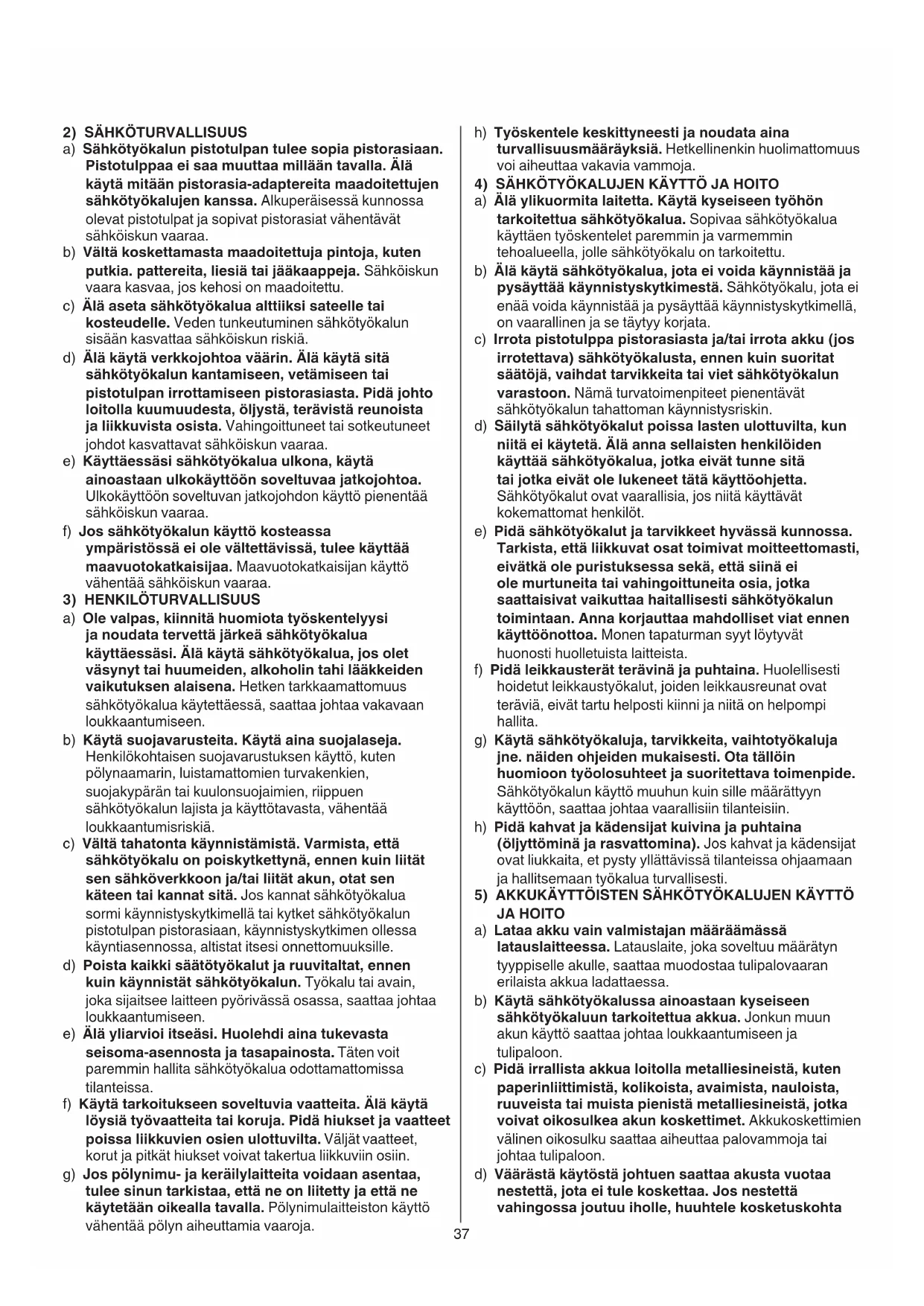 - VAROITUS Lue kaikki tämän sähkötyökalun mukana toimitetut varoitukset, ohjeet, kuvat ja tekniset tiedot. Alla mainittujen ohjeiden noudattamisen laiminlyönti saattaa aiheuttaa sähköiskun, tulipalon ja/tai vakavan loukkaantumisen. Säilytä kaikki turvallisuus- ja muut ohjeet tulevaisuutta varten. Turvallisuusohjeissa käytetty käsite “sähkötyökalu” käsittää verkkokäyttöisiä sähkötyökaluja (verkkojohdolla) ja akkukäyttöisiä sähkötyökaluja (ilman verkkojohtoa).