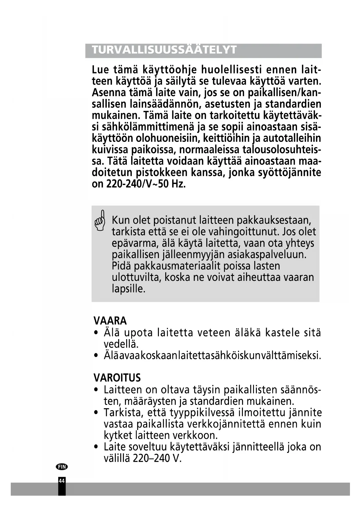 - Laite soveltuu käytettäväksi jännitteellä joka on välillä 220–240 V. FIN4545