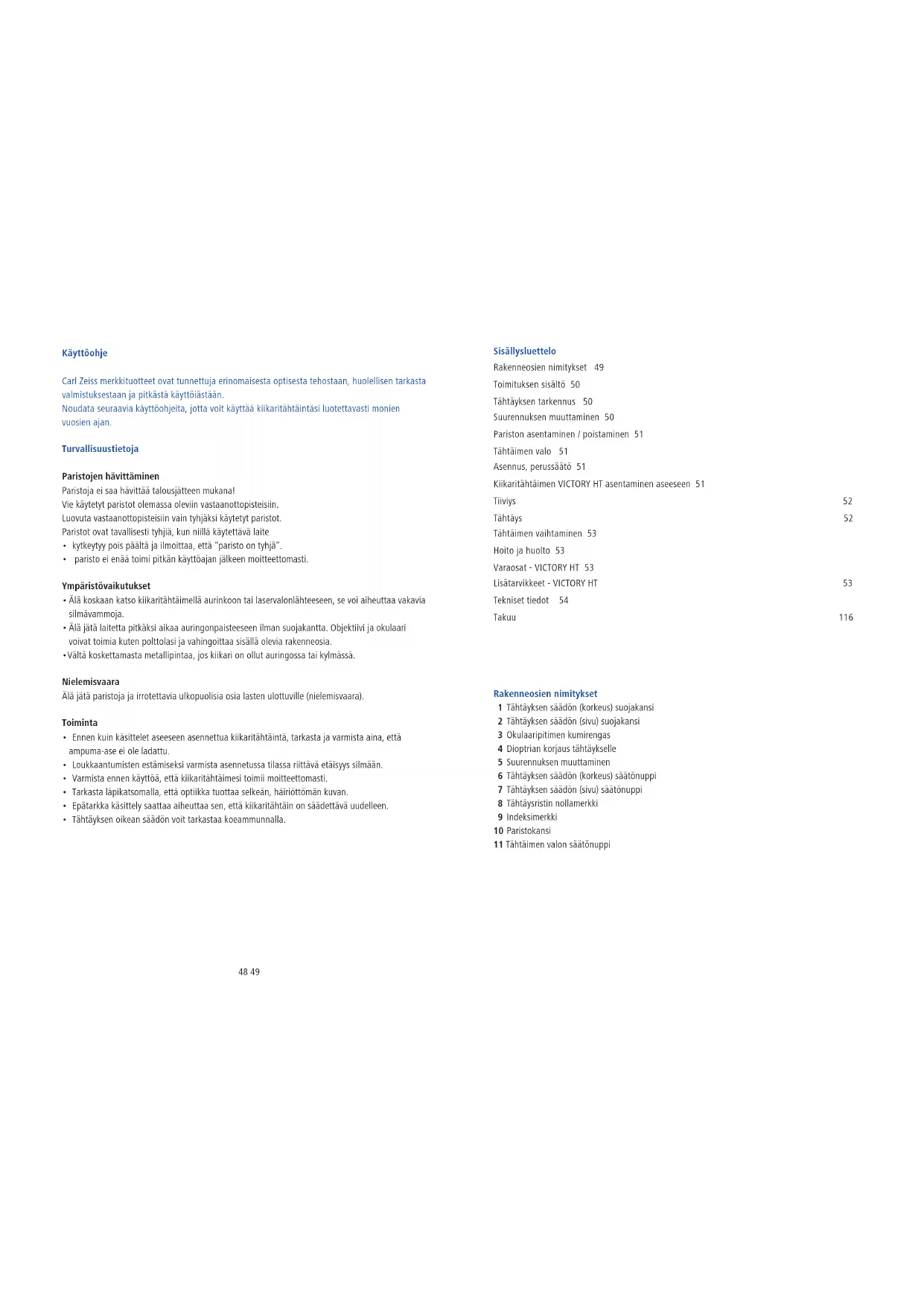 - Tillbehör ingår inte i leveransomfattningen!46 47 Tekniska data VICTORY HT VICTORY HT VICTORY HT VICTORY HT 1,1-4x24 1,5-6x42 2,5-10x50 3-12x56 Förstoring 1,1x 4x 1,5x 6x 2,5x 10x 3x 12x Synfält (m/100m) 38 10,5 24,8 6,9 14,8 4,1 12,5 3,5 Utgångspupill (mm) 14,8 6,0 15,0 7,0 15,0 5,0 14,9 4,7 Dioptrijusteringsområde (dpt) -4 / +2 -4 / +2 -4 / +2 -4 / +2 Ögonavstånd (mm) 90 90 90 90 Parallaxfritt (m) 100 100 100 100 Kvadrat. inställningsområde m/100m 3,0 2,3 1,4 1,2 Justering per klick cm/100m 1 1 1 1 Tubdiameter (mm) 30 30 30 30 Okularrördiameter (mm) 42 42 42 42 Objektivrördiameter (mm) 30 48 56 62 Längd (mm) 289 331 321 347 Vikt utan skena (g) 440 513 525 573 Vikt med skena (g) 465 538 550 598 Ändringar av utförande och leveransomfattning, vilka syftar till teknisk vidareutveckling, förbehållna. Notes48 49 Käyttöohje Carl Zeiss merkkituotteet ovat tunnettuja erinomaisesta optisesta tehostaan, huolellisen tarkasta valmistuksestaan ja pitkästä käyttöiästään. Noudata seuraavia käyttöohjeita, jotta voit käyttää kiikaritähtäintäsi luotettavasti monien vuosien ajan. Turvallisuustietoja Paristojen hävittäminen Paristoja ei saa hävittää talousjätteen mukana! Vie käytetyt paristot olemassa oleviin vastaanottopisteisiin. Luovuta vastaanottopisteisiin vain tyhjäksi käytetyt paristot. Paristot ovat tavallisesti tyhjiä, kun niillä käytettävä laite kytkeytyy pois päältä ja ilmoittaa, että ”paristo on tyhjä”. paristo ei enää toimi pitkän käyttöajan jälkeen moitteettomasti. Ympäristövaikutukset Älä koskaan katso kiikaritähtäimellä aurinkoon tai laservalonlähteeseen, se voi aiheuttaa vakavia silmävammoja. Älä jätä laitetta pitkäksi aikaa auringonpaisteeseen ilman suojakantta. Objektiivi ja okulaari voivat toimia kuten polttolasi ja vahingoittaa sisällä olevia rakenneosia. Vältä koskettamasta metallipintaa, jos kiikari on ollut auringossa tai kylmässä. Nielemisvaara Älä jätä paristoja ja irrotettavia ulkopuolisia osia lasten ulottuville (nielemisvaara). Toiminta Ennen kuin käsittelet aseeseen asennettua kiikaritähtäintä, tarkasta ja varmista aina, että ampuma-ase ei ole ladattu. Loukkaantumisten estämiseksi varmista asennetussa tilassa riittävä etäisyys silmään. Varmista ennen käyttöä, että kiikaritähtäimesi toimii moitteettomasti. Tarkasta läpikatsomalla, että optiikka tuottaa selkeän, häiriöttömän kuvan. Epätarkka käsittely saattaa aiheuttaa sen, että kiikaritähtäin on säädettävä uudelleen. Tähtäyksen oikean säädön voit tarkastaa koeammunnalla. Sisällysluettelo Rakenneosien nimitykset 49 Toimituksen sisältö 50 Tähtäyksen tarkennus 50 Suurennuksen muuttaminen 50 Pariston asentaminen / poistaminen 51 Tähtäimen valo 51 Asennus, perussäätö 51 Kiikaritähtäimen VICTORY HT asentaminen aseeseen 51 Tiiviys 52 Tähtäys 52 Tähtäimen vaihtaminen 53 Hoito ja huolto 53 Varaosat - VICTORY HT 53 Lisätarvikkeet - VICTORY HT 53 Tekniset tiedot 54 Takuu 116 Rakenneosien nimitykset 1 Tähtäyksen säädön (korkeus) suojakansi 2 Tähtäyksen säädön (sivu) suojakansi 3 Okulaaripitimen kumirengas 4 Dioptrian korjaus tähtäykselle 5 Suurennuksen muuttaminen 6 Tähtäyksen säädön (korkeus) säätönuppi 7 Tähtäyksen säädön (sivu) säätönuppi 8 Tähtäysristin nollamerkki 9 Indeksimerkki 10 Paristokansi 11 Tähtäimen valon säätönuppi50 51 Toimituksen sisältö VICTORY HT kiikaritähtäimet tähtäimen valolla Tuote Tilausnumero Toimituksen sisältö VICTORY HT 1,1-4 x 24 M 522404 Kiikaritähtäin Suojakansi Paristokansi Litium-paristo 3V CR 2032 Korotuskansi Optiikan puhdistusliina Käyttöohje Takuukortti Laatusertifikaatti VICTORY HT 1,1-4 x 24 522405 VICTORY HT 1,5-6 x 42 M 522414 VICTORY HT 1,5-6 x 42 522415 VICTORY HT 2,5-10 x 50 M 522424 VICTORY HT 2,5-10 x 50 522425 VICTORY HT 3-12 x 56 M 522434 VICTORY HT 3-12 x 56 522435 Tähtäyksen tarkennus Tähtäyksen tarkennus tehdään kiertämällä okulaaria (4). Säätö kannattaa tehdä suurella zoomauksella. Tähtäys pysyy sen jälkeen koko zoomausalueella yhtä tarkkana. Ota huomioon, että VICTORY HT sarjan kiikaritähtäimissä ei ole mahdollista samanaikaisesti tarkentaa tähtäystä ja kuvaa isolla zoomilla ja alle 100 m tähtäysetäisyyksillä, koska nämä kiikaritähtäimet on säädetty 100 m parallaksivapaalle etäisyydelle. Selvästi lyhemmillä kuin 100 m tähtäysetäisyyksillä on suositeltavaa käyttää pienempää zoomausasetusta. Ohje: Onnettomuuksien ehkäisemiseksi okulaaripidikkeeseen on asennettu kumirengas (3). Zoomauksen muuttaminen Voit säätää kaikki zoomaukset portaattomasti alimman ja ylimmän suurennusasteen välillä. Zoomausta muutetaan kääntämällä okulaari-istukan vaihtokosketinta (5). Zoomausasteet on merkitty luvuilla ja merkinnöillä. Ohje: Käyttö hämärässä tai yöllä: Käännetään vasemmalle vasteeseen asti – suurin zoomaus. Käännetään oikealle vasteeseen asti – pienin zoomaus. Kun zoomauksen vaihtokoskettimen nokka osoittaa ylöspäin, on zoomaus säädetty keskimääräiseksi. Pariston asentaminen / poistaminen Paristoa (tyyppi CR 2032) asentaessasi kierrä kansi (10) vasemmalle (vastapäivään) ulos. Paristo asennetaan plusnapa ylöspäin. Kierrä lopuksi kansi (10) takaisin kiinni. Varmista tällöin, että tiivisterengas on kunnolla ja oikein paikallaan. Vahingoittunut tiivisterengas pitää vaihtaa uuteen. Ohje: Jos et pitkään aikaan käytä kiikaritähtäintä, poista siitä paristo. Tähtäimen valo Valo kytketään päälle vetämällä säätönupista (11). Nuppia oikealle kiertämällä (myötäpäivään) lisätään valon kirkkautta. Nuppia vasemmalle kääntämällä (vastapäivään) vähennetään valon kirkkautta. Säätö tapahtuu portaattomasti esiasetettuun minimiin tai maksimiin eikä siinä ole mitään mekaanista vastetta. Valo kytketään pois päältä painamalla nuppia kiikaritähtäimen kotelon suuntaan. Kun kirkkaus on s