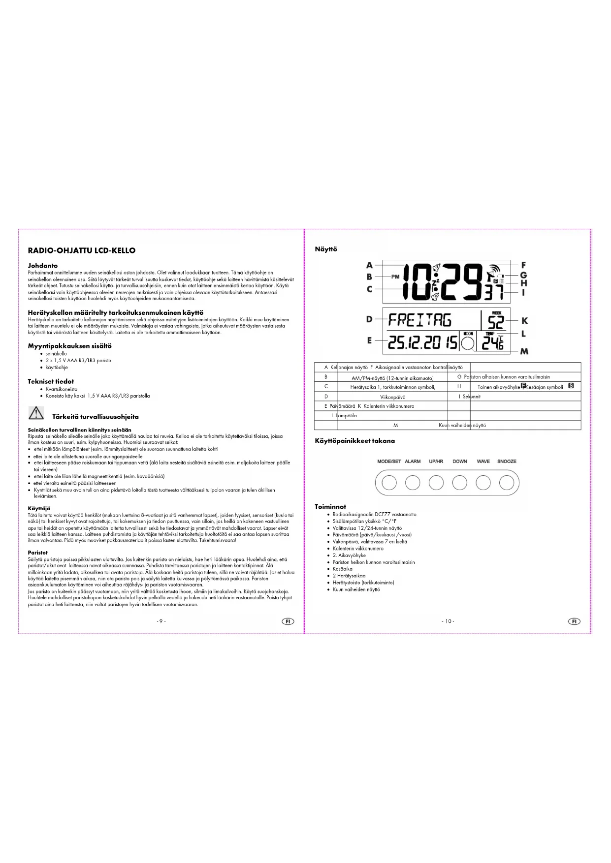 RADIO-OHJATTU LCD-KELLO Johdanto Parhaimmat onnittelumme uuden seinäkellosi oston johdosta. Olet valinnut laadukkaan tuotteen. Tämä käyttöohje on seinäkellon olennainen osa. Siitä löytyvät tärkeät turvallisuutta koskevat tiedot, käyttöohje sekä laitteen hävittämistä käsittelevät tärkeät ohjeet. Tutustu seinäkellosi käyttö- ja turvallisuusohjeisiin, ennen kuin otat laitteen ensimmäistä kertaa käyttöön. Käytä seinäkelloasi vain käyttöohjeessa olevien neuvojen mukaisesti ja vain ohjeissa olevaan käyttötarkoitukseen. Antaessasi seinäkellosi toisten käyttöön huolehdi myös käyttöohjeiden mukaanantamisesta. Herätyskellon määritelty tarkoituksenmukainen käyttö Herätyskello on tarkoitettu kellonajan näyttämiseen sekä ohjeissa esitettyjen lisätoimintojen käyttöön. Kaikki muu käyttäminen tai laitteen muuntelu ei ole määräysten mukaista. Valmistaja ei vastaa vahingoista, jotka aiheutuvat määräysten vastaisesta käytöstä tai väärästä laitteen käsittelystä. Laitetta ei ole tarkoitettu ammattimaiseen käyttöön. Myyntipakkauksen sisältö