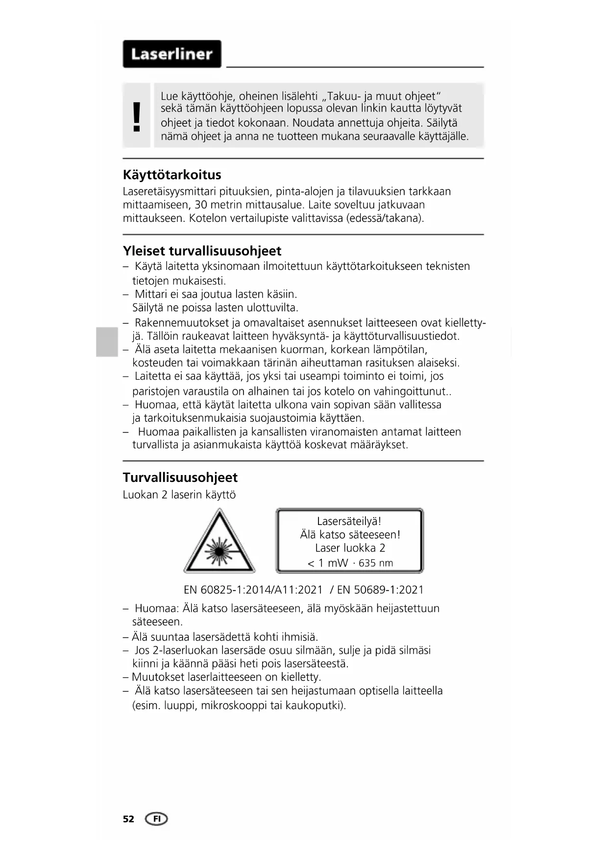 Yleiset turvallisuusohjeet – Käytä laitetta yksinomaan ilmoitettuun käyttötarkoitukseen teknisten tietojen mukaisesti. – Mittari ei saa joutua lasten käsiin. Säilytä ne poissa lasten ulottuvilta. – Rakennemuutokset ja omavaltaiset asennukset laitteeseen ovat kielletty- jä. Tällöin raukeavat laitteen hyväksyntä- ja käyttöturvallisuustiedot. – Älä aseta laitetta mekaanisen kuorman, korkean lämpötilan, kosteuden tai voimakkaan tärinän aiheuttaman rasituksen alaiseksi. – Laitetta ei saa käyttää, jos yksi tai useampi toiminto ei toimi, jos paristojen varaustila on alhainen tai jos kotelo on vahingoittunut.. – Huomaa, että käytät laitetta ulkona vain sopivan sään vallitessa ja tarkoituksenmukaisia suojaustoimia käyttäen. – Huomaa paikallisten ja kansallisten viranomaisten antamat laitteen turvallista ja asianmukaista käyttöä koskevat määräykset. Lasersäteilyä! Älä katso säteeseen! Laser luokka 2 < 1 mW