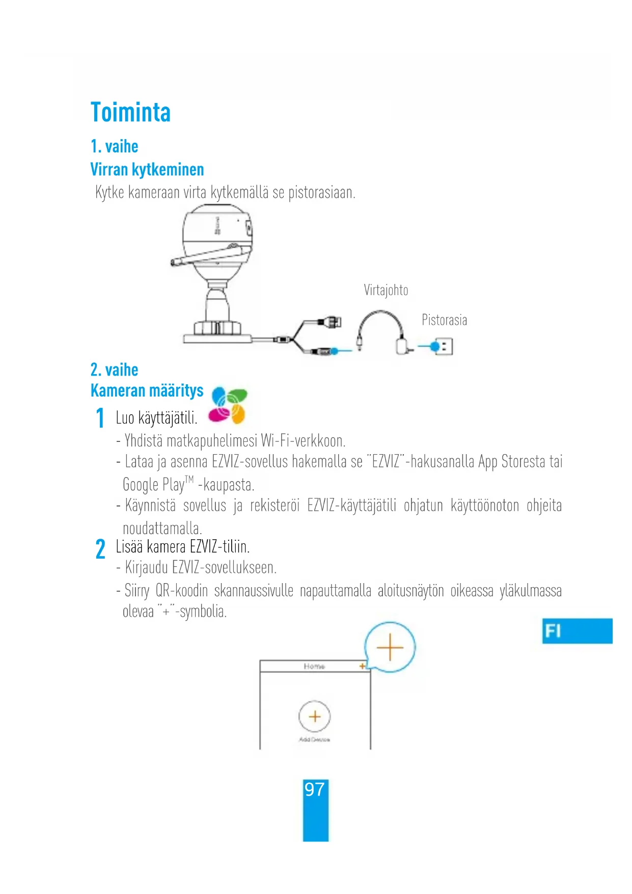 Luo käyttäjätili. - Yhdistä matkapuhelimesi Wi-Fi-verkkoon. - Lataa ja asenna EZVIZ-sovellus hakemalla se ”EZVIZ”-hakusanalla App Storesta tai Google Play