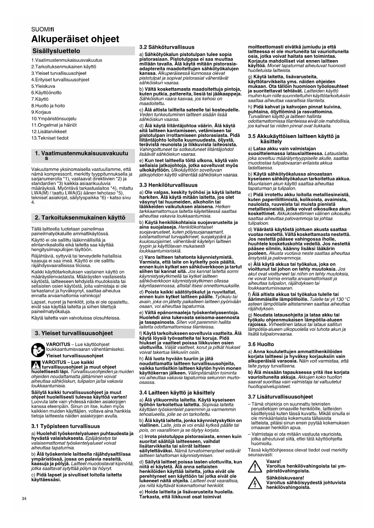 Tällä laitteella tuotetaan paineilmaa paineilmatyökaluille ammattikäytössä. Käyttö ei ole sallittu lääkinnällisillä ja elintarvikealoilla eikä laitetta saa käyttää hengitysilmapullojen täyttöön. Räjähtäviä, syttyviä tai terveydelle haitallisia kaasuja ei saa imeä. Käyttö ei ole sallittu räjähdysvaarallisissa tiloissa. Kaikki käyttötarkoituksen vastainen käyttö on määräystenvastaista. Määräysten vastaisesta käytöstä, laitteeseen tehdyistä muutoksista tai sellaisten osien käytöstä, joita valmistaja ei ole tarkastanut ja hyväksynyt, saattaa aiheutua ennalta arvaamattomia vahinkoja! Lapset, nuoret ja henkilöt, joita ei ole opastettu, eivät saa käyttää laitetta ja siihen liitettyjä paineilmatyökaluja. Käytä laitetta vain valvotuissa olosuhteissa. VAROITUS – Lue käyttöohjeet loukkaantumisvaaran vähentämiseksi. Yleiset turvallisuusohjeet VAROITUS – Lue kaikki turvallisuusohjeet ja muut ohjeet huolellisesti läpi. Turvallisuusohjeiden ja muiden ohjeiden noudattamatta jättäminen voivat aiheuttaa sähköiskun, tulipalon ja/tai vakavia loukkaantumisia. Säilytä kaikki turvallisuusohjeet ja muut ohjeet huolellisesti tulevaa käyttöä varten! Luovuta laite vain yhdessä näiden asiakirjojen kanssa eteenpäin. Sinun on itse, kuten myös kaikkien muiden käyttäjien, voitava aina hankkia tietoja laitteesta näiden asiakirjojen avulla.