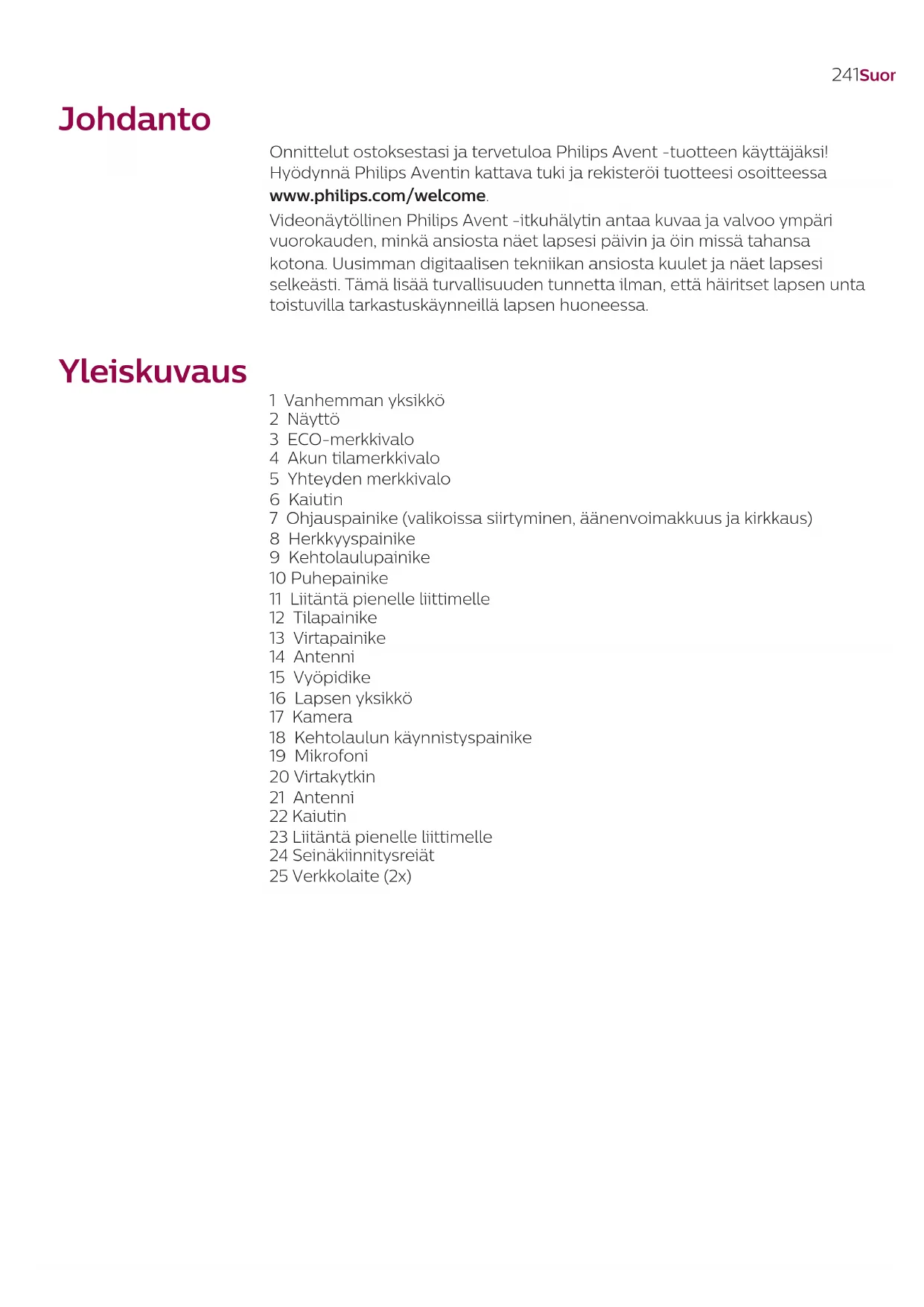 Pergunta Resposta Porque é que obtenho interferência na unidade dos pais? Por que razão o visor de vídeo da unidade dos pais cintila? Poderão ocorrer interferências se a unidade dos pais estiver estar fora de alcance da unidade do bebé. Poderão também ocorrer interferências se existirem várias paredes ou tetos entre a unidade dos pais e a unidade do bebé ou se estiverem ligados outros dispositivos sem os de 2,4 GHz (por exemplo, micro-ondas, routers Wi-Fi, etc.). É possível que tenha mais de 2 conjuntos de intercomunicadores e ocorram interferências. Mantenha essas 2 unidades para bebé afastadas, idealmente em divisões diferentes. Coloque a unidade dos pais num local diferente, mais próximo da unidade do bebé, ou desligue outros dispositivos sem os. A bateria recarregável da unidade dos pais poderá necessitar de carregamento. Por que razão não existe qualquer imagem no visor de vídeo, embora a luz de ligação esteja verde? A unidade dos pais poderá estar nos modos AUDIO (Áudio), VOX (Voz) ou ECO. Prima o botão de modo no lado direito da unidade dos pais para mudar de modo (consultar 'Modos'). Porque é que a imagem no visor de vídeo não é nítida? O brilho do visor poderá estar demasiado baixo. Aumente o brilho do visor na unidade dos pais através do botão de controlo no centro. Talvez a lente da unidade do bebé esteja suja. Limpe a lente com um pano seco. A unidade do bebé poderá estar demasiado afastada do bebé. Certique- se de que a unidade do bebé não está a mais de 1,5 metros de distância do bebé, para obter uma qualidade de vídeo otimizada. O perigo de estrangulamento aumenta se a distância for inferior a 1 metro.240 Português Montagem na parede Instruções de impressão: Imprima esta página na escala de 100 % e utilize o modelo para marcar a posição exata dos orifícios para os parafusos na parede. Informações gerais Bateria de iões de lítio recarregável (2600 mAh) Frequência de banda FHSS de 2,4 GHz. Potência máxima de radiofrequência: < = 20 dBm Unidade de alimentação: Modelo: ASSA105E-050100 (cha UE) ou ASSA105B-050100 (cha RU) Entrada: 100-240 V 50/60 Hz ~0,35 A Saída: 5,0 V 1,0 A, 5,0 W Eciência média no estado ativo: >=73,62% Consumo de energia sem carga (W): 0,1 W241Suomi Johdanto Onnittelut ostoksestasi ja tervetuloa Philips Avent -tuotteen käyttäjäksi! Hyödynnä Philips Aventin kattava tuki ja rekisteröi tuotteesi osoitteessa www.philips.com/welcome. Videonäytöllinen Philips Avent -itkuhälytin antaa kuvaa ja valvoo ympäri vuorokauden, minkä ansiosta näet lapsesi päivin ja öin missä tahansa kotona. Uusimman digitaalisen tekniikan ansiosta kuulet ja näet lapsesi selkeästi. Tämä lisää turvallisuuden tunnetta ilman, että häiritset lapsen unta toistuvilla tarkastuskäynneillä lapsen huoneessa. Yleiskuvaus 1 Vanhemman yksikkö 2 Näyttö 3 ECO-merkkivalo 4 Akun tilamerkkivalo 5 Yhteyden merkkivalo 6 Kaiutin 7 Ohjauspainike (valikoissa siirtyminen, äänenvoimakkuus ja kirkkaus) 8 Herkkyyspainike 9 Kehtolaulupainike 10 Puhepainike 11 Liitäntä pienelle liittimelle 12 Tilapainike 13 Virtapainike 14 Antenni 15 Vyöpidike 16 Lapsen yksikkö 17 Kamera 18 Kehtolaulun käynnistyspainike 19 Mikrofoni 20 Virtakytkin 21 Antenni 22 Kaiutin 23 Liitäntä pienelle liittimelle 24 Seinäkiinnitysreiät 25 Verkkolaite (2x)242 Suomi Tärkeitä turvallisuustietoja Lue nämä tärkeät tiedot huolellisesti ennen laitteen ensimmäistä käyttökertaa ja säilytä ne vastaisen varalle. TÄRKEÄÄ Tämä itkuhälytin on tarkoitettu apuvälineeksi. Se ei korvaa vastuuntuntoisen aikuisen valvontaa eikä sitä saa käyttää tämän korvikkeena.Älä koskaan jätä lasta yksin kotiin. Varmista aina, että paikalla on joku pitämässä lapsesta huolta tarvittaessa. Vastuuvapauslauseke Ota huomioon, että käytät tätä itkuhälytintä omalla vastuullasi. Koninklijke Philips N.V. ja sen tytäryhtiöt eivät ole vastuussa tämän itkuhälyttimen toiminnasta tai sen käytöstä eivätkä vastaa mistään sen käyttöön liittyvistä mahdollisista ongelmista tai vahingoista. Vaara - Älä upota mitään itkuhälyttimen osaa veteen tai muuhun nesteeseen. Älä aseta laitetta paikkaan, jossa sen päälle voi tippua tai roiskua vettä tai muuta nestettä. Älä käytä itkuhälytintä kosteissa paikoissa tai veden lähellä. - Älä aseta mitään itkuhälyttimen päälle tai peitä laitetta. Älä tuki tuuletusaukkoja. Asenna laite valmistajan ohjeiden mukaisesti. Varoitus: Kuristumisvaara–lapsia on KURISTUNUT johtoihin. Pidä johto poissa lasten ulottuvilta (ainakin 1 metrin päässä). Älä irrota tätä lappua. Varoitus - Tarkista, että virtajohtosovittimen jännitemerkintä vastaa paikallista verkkojännitettä, ennen kuin yhdistät laitteen sähköverkkoon. - Älä muokkaa tai leikkaa mitään verkkolaitteen tai sen sovittimen osaa, sillä se aiheuttaa vaaratilanteen. - Käytä vain laitteen mukana toimitettua virtalähdesovitinta. - Jos virtajohtosovitin on vaurioitunut, vaihda vaaratilanteiden välttämiseksi tilalle aina alkuperäisen tyyppinen virtajohtosovitin. - Laitetta voivat käyttää myös yli 8-vuotiaat lapset ja henkilöt, joiden fyysinen tai henkinen toimintakyky on rajoittunut tai joilla ei ole kokemusta tai tietoa laitteen käytöstä, jos heitä on neuvottu laitteen turvallisesta käytöstä tai tarjolla on turvallisen käytön edellyttämä valvonta ja jos he ymmärtävät laitteeseen liittyvät vaarat. Lasten ei pidä leikkiä laitteella. Lasten ei saa antaa puhdistaa tai huoltaa laitetta ilman valvontaa. - Suojaa virtajohtoa taittumiselta ja päälle astumiselta. Käsittele varovasti etenkin pistokkeita, pistorasiaa ja liitoskohtia.243Suomi - Varmista, että asennat itkuhälyttimen siten, että sen johto ei ole oviaukossa tai kulkureitillä. Jos asetat itkuhälyttimen pöydälle tai matalaan kaappiin, älä jätä virtajohtoa roikkumaan pöydän tai kaapin reunan yli. Varmista, että johto ei 