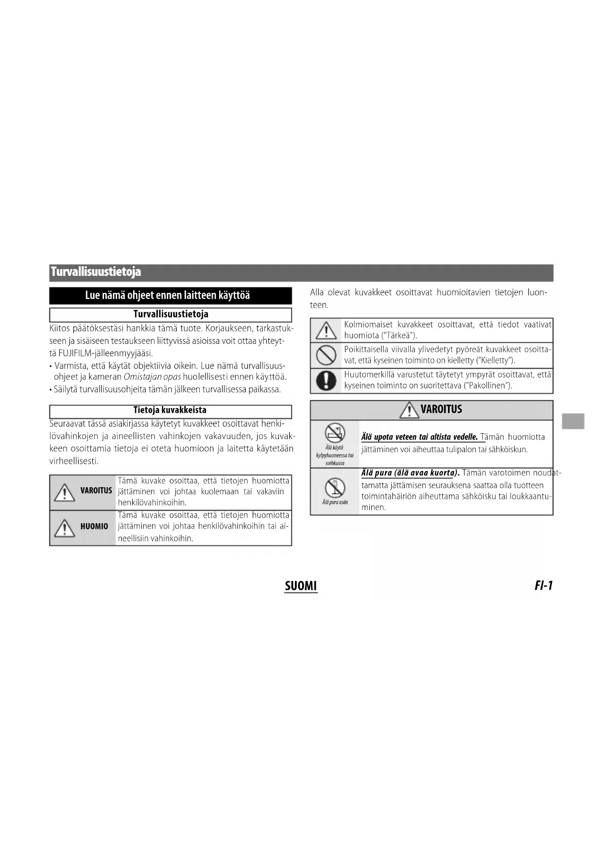 - Säilytä turvallisuusohjeita tämän jälkeen turvallisessa paikassa. Tietoja kuvakkeista Seuraavat tässä asiakirjassa käytetyt kuvakkeet osoittavat henki- lövahinkojen ja aineellisten vahinkojen vakavuuden, jos kuvak- keen osoittamia tietoja ei oteta huomioon ja laitetta käytetään virheellisesti. VAROITUS Tämä kuvake osoittaa, että tietojen huomiotta jättäminen voi johtaa kuolemaan tai vakaviin henkilövahinkoihin. HUOMIO Tämä kuvake osoittaa, että tietojen huomiotta jättäminen voi johtaa henkilövahinkoihin tai ai- neellisiin vahinkoihin. Alla olevat kuvakkeet osoittavat huomioitavien tietojen luon- teen. Kolmiomaiset kuvakkeet osoittavat, että tiedot vaativat huomiota ("Tärkeä"). Poikittaisella viivalla ylivedetyt pyöreät kuvakkeet osoitta- vat, että kyseinen toiminto on kielletty (”Kielletty”). Huutomerkillä varustetut täytetyt ympyrät osoittavat, että kyseinen toiminto on suoritettava ("Pakollinen").