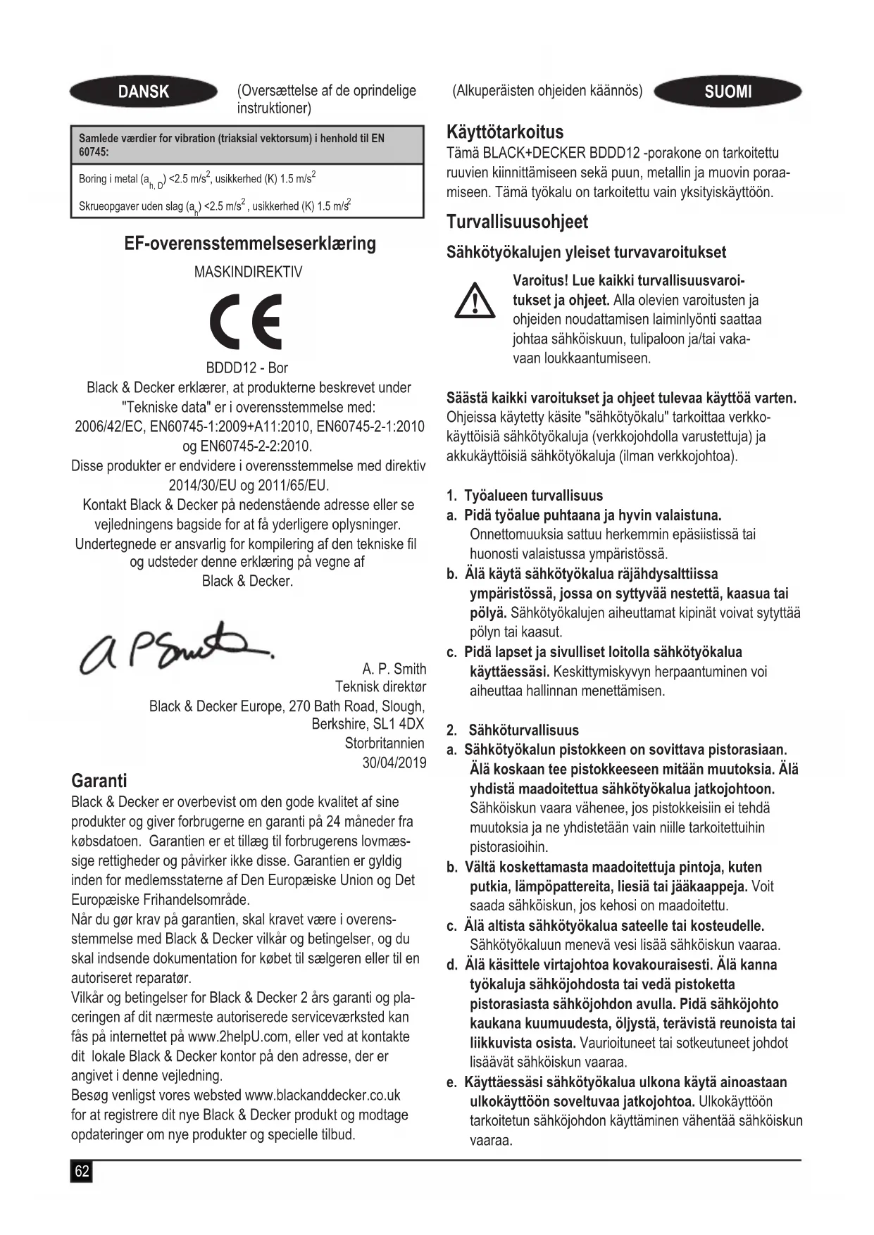 BDDD12 - Porakone Black & Decker ilmoittaa, että tuotteet, jotka on kuvattu kohdassa Tekniset tiedot, täyttävät seuraavien direktiivien vaatimukset: 2006/42/EY, EN60745-1:2009+A11:2010, EN60745-2-1:2010 ja EN60745-2-2:2010. Nämä tuotteet täyttävät myös direktiivien 2014/30/EU ja 2011/65/EU vaatimukset. Lisätietoja saa ottamalla yhteyden Black & Deckeriin seuraavassa osoitteessa. Tiedot ovat myös käyttöohjeen takakannessa. Allekirjoittaja vastaa teknisistä tiedoista ja antaa tämän vakuu- tuksen seuraavan yhtiön puolesta: Black & Decker. A. P. Smith Tekninen päällikkö Black & Decker Europe, 270 Bath Road, Slough, Berkshire, SL1 4DX Iso-Britannia