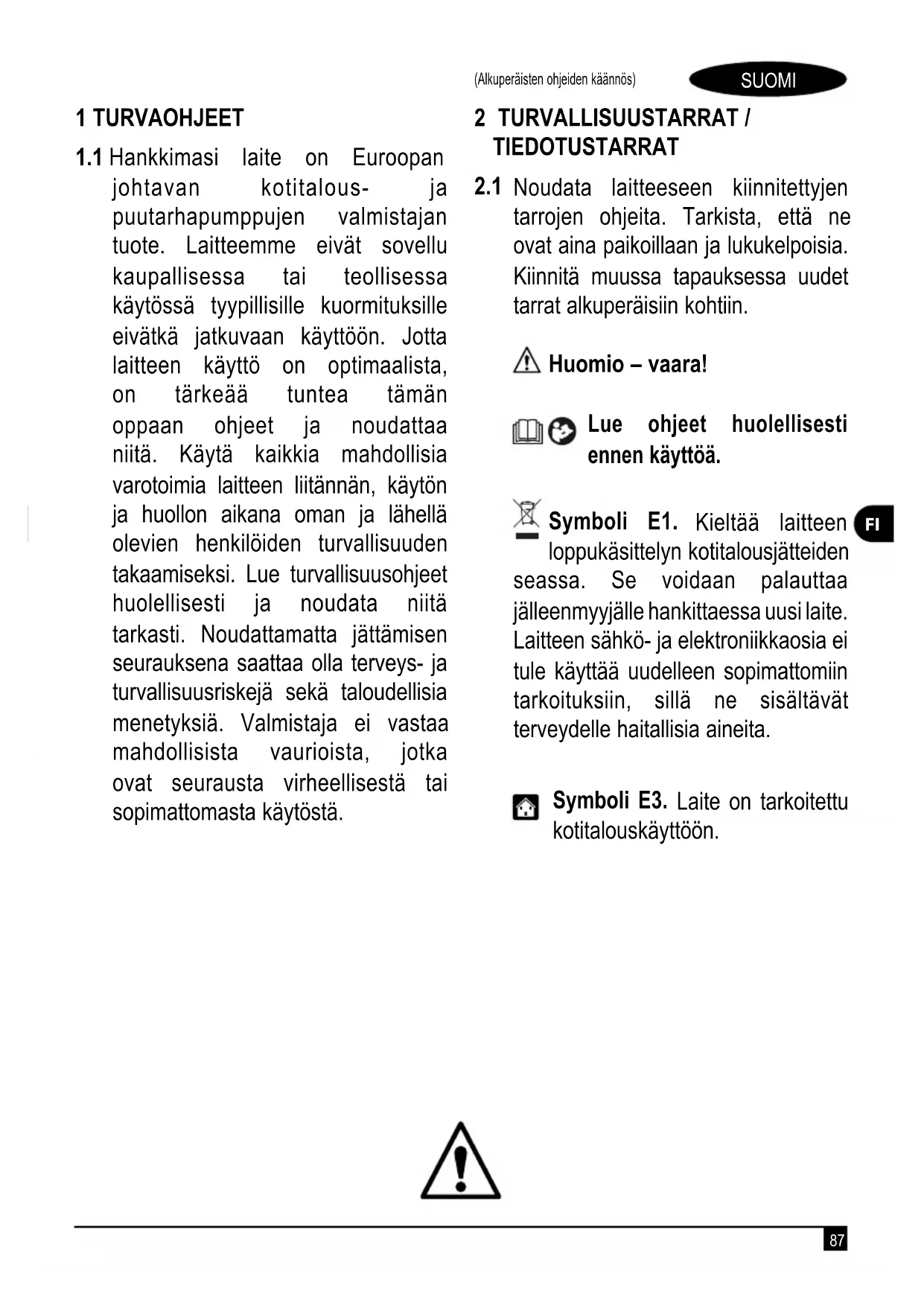Noudata laitteeseen kiinnitettyjen tarrojen ohjeita. Tarkista, että ne ovat aina paikoillaan ja lukukelpoisia. Kiinnitä muussa tapauksessa uudet tarrat alkuperäisiin kohtiin. Huomio – vaara! Lue ohjeet huolellisesti ennen käyttöä. Symboli E1. Kieltää laitteen loppukäsittelyn kotitalousjätteiden seassa. Se voidaan palauttaa jälleenmyyjälle hankittaessa uusi laite. Laitteen sähkö- ja elektroniikkaosia ei tule käyttää uudelleen sopimattomiin tarkoituksiin, sillä ne sisältävät terveydelle haitallisia aineita. Symboli E3. Laite on tarkoitettu kotitalouskäyttöön.88 SUOMI (Alkuperäisten ohjeiden käännös)