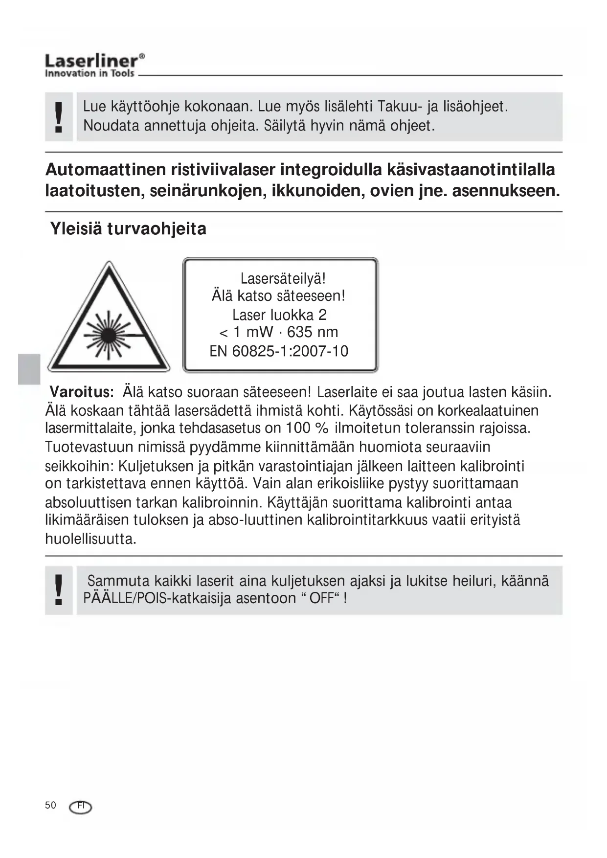 Manual_SmartLineLaser360_Rev.0413.indd 49 13.05.13 09:1850 Lue käyttöohje kokonaan. Lue myös lisälehti Takuu- ja lisäohjeet. Noudata annettuja ohjeita. Säilytä hyvin nämä ohjeet.