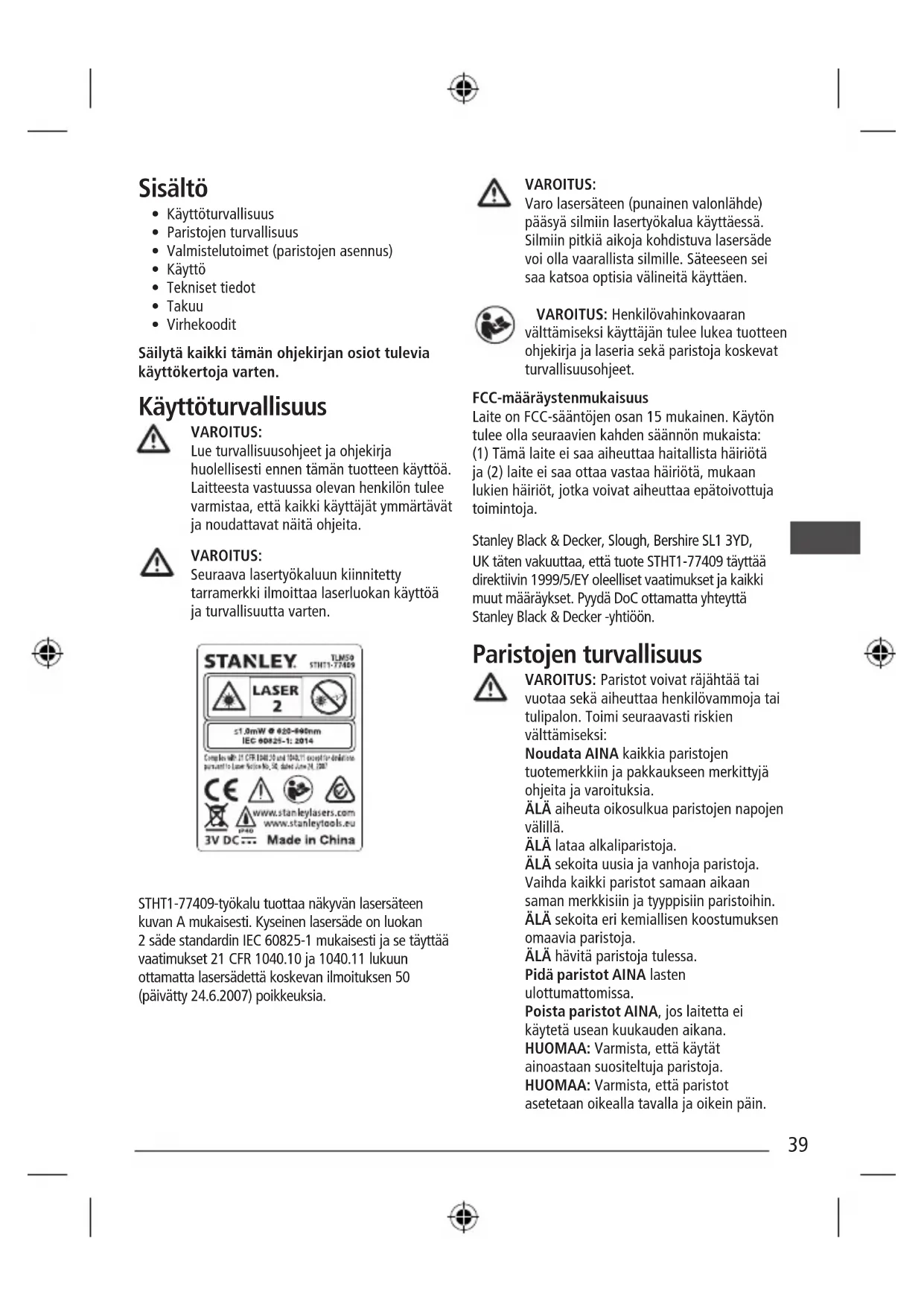 - Virhekoodit Säilytä kaikki tämän ohjekirjan osiot tulevia käyttökertoja varten. Käyttöturvallisuus VAROITUS: Lue turvallisuusohjeet ja ohjekirja huolellisesti ennen tämän tuotteen käyttöä. Laitteesta vastuussa olevan henkilön tulee varmistaa, että kaikki käyttäjät ymmärtävät ja noudattavat näitä ohjeita. VAROITUS: Seuraava lasertyökaluun kiinnitetty tarramerkki ilmoittaa laserluokan käyttöä ja turvallisuutta varten. STHT1-77409-työkalu tuottaa näkyvän lasersäteen kuvan A mukaisesti. Kyseinen lasersäde on luokan 2 säde standardin IEC 60825-1 mukaisesti ja se täyttää vaatimukset 21 CFR 1040.10 ja 1040.11 lukuun ottamatta lasersädettä koskevan ilmoituksen 50 (päivätty 24.6.2007) poikkeuksia. VAROITUS: Varo lasersäteen (punainen valonlähde) pääsyä silmiin lasertyökalua käyttäessä. Silmiin pitkiä aikoja kohdistuva lasersäde voi olla vaarallista silmille. Säteeseen sei saa katsoa optisia välineitä käyttäen. VAROITUS: Henkilövahinkovaaran välttämiseksi käyttäjän tulee lukea tuotteen ohjekirja ja laseria sekä paristoja koskevat turvallisuusohjeet. FCC-määräystenmukaisuus Laite on FCC-sääntöjen osan 15 mukainen. Käytön tulee olla seuraavien kahden säännön mukaista: (1) Tämä laite ei saa aiheuttaa haitallista häiriötä ja (2) laite ei saa ottaa vastaa häiriötä, mukaan lukien häiriöt, jotka voivat aiheuttaa epätoivottuja toimintoja. Stanley Black & Decker, Slough, Bershire SL1 3YD, UK täten vakuuttaa, että tuote STHT1-77409 täyttää direktiivin 1999/5/EY oleelliset vaatimukset ja kaikki muut määräykset. Pyydä DoC ottamatta yhteyttä Stanley Black & Decker -yhtiöön. Paristojen turvallisuus VAROITUS: Paristot voivat räjähtää tai vuotaa sekä aiheuttaa henkilövammoja tai tulipalon. Toimi seuraavasti riskien välttämiseksi: Noudata AINA kaikkia paristojen tuotemerkkiin ja pakkaukseen merkittyjä ohjeita ja varoituksia. ÄLÄ aiheuta oikosulkua paristojen napojen välillä. ÄLÄ lataa alkaliparistoja. ÄLÄ sekoita uusia ja vanhoja paristoja. Vaihda kaikki paristot samaan aikaan saman merkkisiin ja tyyppisiin paristoihin. ÄLÄ sekoita eri kemiallisen koostumuksen omaavia paristoja. ÄLÄ hävitä paristoja tulessa. Pidä paristot AINA lasten ulottumattomissa. Poista paristot AINA, jos laitetta ei käytetä usean kuukauden aikana. HUOMAA: Varmista, että käytät ainoastaan suositeltuja paristoja. HUOMAA: Varmista, että paristot asetetaan oikealla tavalla ja oikein päin. 39Valmistelutoimet (paristojen asennus)