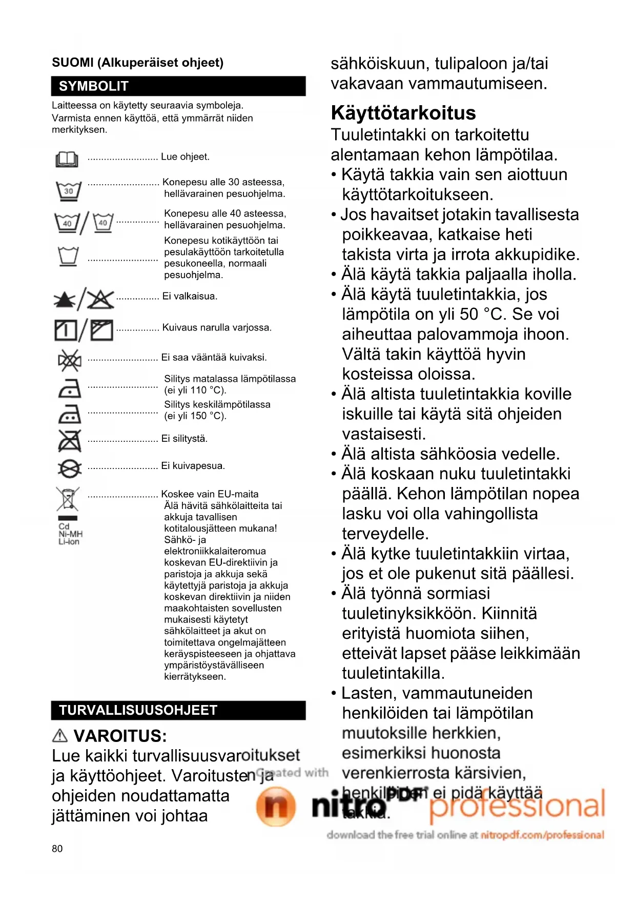 - Enkelte av elementene på listen kan være inkludert som standard tilbehør i pakken. Disse elementene kan variere fra land til land. VEDLIKEHOLD EKSTRAUTSTYR80 SUOMI (Alkuperäiset ohjeet) Laitteessa on käytetty seuraavia symboleja. Varmista ennen käyttöä, että ymmärrät niiden merkityksen. VAROITUS: Lue kaikki turvallisuusvaroitukset ja käyttöohjeet. Varoitusten ja ohjeiden noudattamatta jättäminen voi johtaa sähköiskuun, tulipaloon ja/tai vakavaan vammautumiseen. Käyttötarkoitus Tuuletintakki on tarkoitettu alentamaan kehon lämpötilaa.