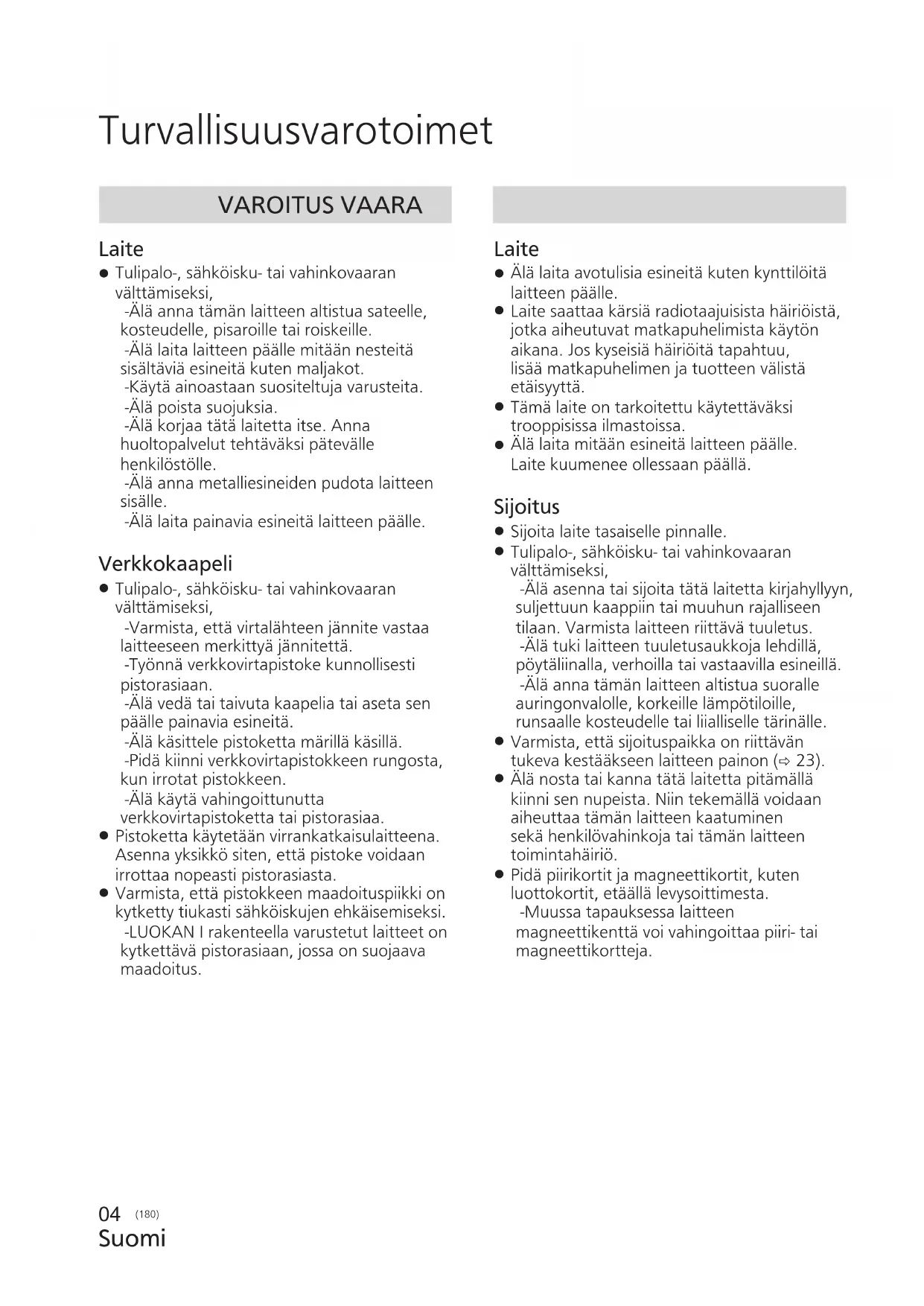 Tulipalo-, sähköisku- tai vahinkovaaran välttämiseksi, -Älä anna tämän laitteen altistua sateelle, kosteudelle, pisaroille tai roiskeille. -Älä laita laitteen päälle mitään nesteitä sisältäviä esineitä kuten maljakot. -Käytä ainoastaan suositeltuja varusteita. -Älä poista suojuksia. -Älä korjaa tätä laitetta itse. Anna huoltopalvelut tehtäväksi pätevälle henkilöstölle. -Älä anna metalliesineiden pudota laitteen sisälle. -Älä laita painavia esineitä laitteen päälle. Verkkokaapeli