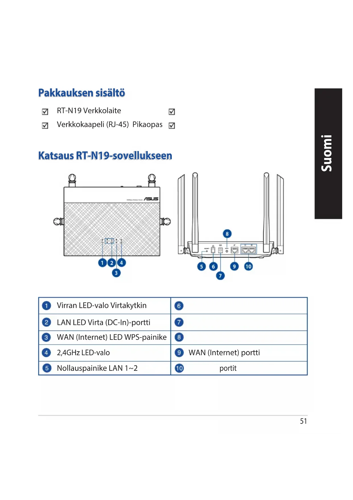 - Võrgusloetavakasutujuhendisaatesaidilthttps://www.asus.com/support51 Suomi Katsaus RT-N19-sovellukseen Pakkauksen sisältö RT-N19 Verkkolaite Verkkokaapeli (RJ-45) Pikaopas Virran LED-valo Virtakytkin LAN LED Virta (DC-In)-portti WAN (Internet) LED WPS-painike 2,4GHz LED-valo WAN (Internet) portti Nollauspainike LAN 1~2 portit Suomi52 Suomi Reitittimen sijoittaminen Varmistaaksesi parhaan signaalin lähetyksen langattoman reitittimen ja siihen liitettyjen verkkolaitteiden välillä, tarkista, että: