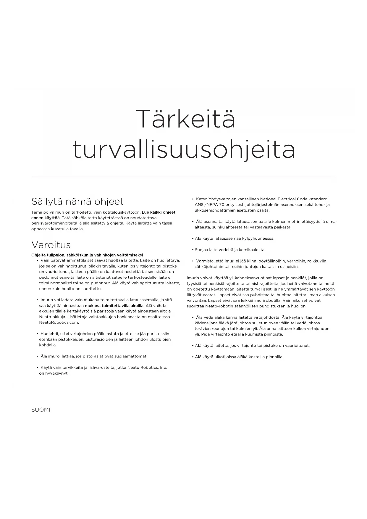 - Varmista, että imuri ei jää kiinni pöytäliinoihin, verhoihin, roikkuviin sähköjohtoihin tai muihin johtojen kaltaisiin esineisiin. Imuria voivat käyttää yli kahdeksanvuotiaat lapset ja henkilöt, joilla on fyysisiä tai henkisiä rajoitteita tai aistirajoitteita, jos heitä valvotaan tai heitä on opetettu käyttämään laitetta turvallisesti ja he ymmärtävät sen käyttöön liittyvät vaarat. Lapset eivät saa puhdistaa tai huoltaa laitetta ilman aikuisen valvontaa. Lapset eivät saa leikkiä imurirobotilla. Vain aikuiset voivat suorittaa Neato-robotin säännöllisen puhdistuksen ja huollon.