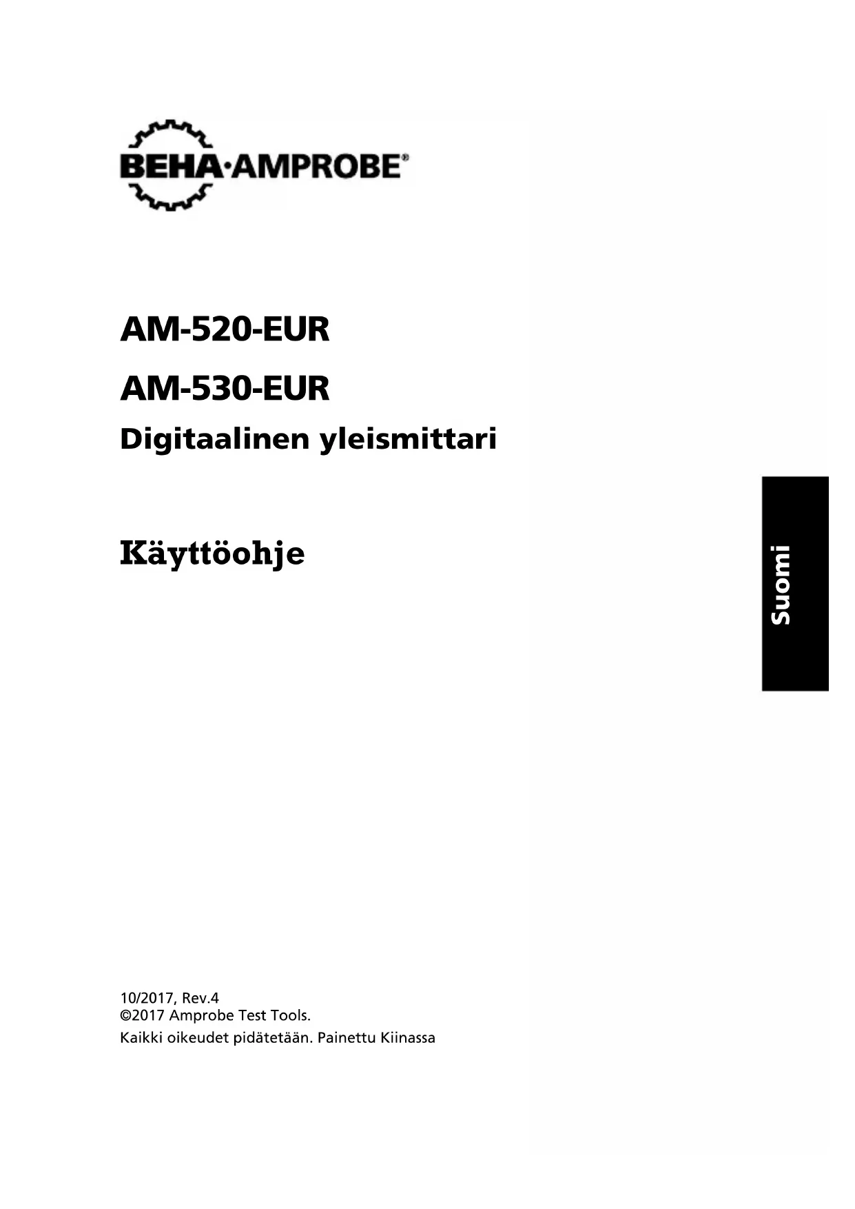 9V battery F2Suomi AM-520-EUR AM-530-EUR Digitaalinen yleismittari Käyttöohje 10/2017, Rev.4 ©2017 Amprobe Test Tools. Kaikki oikeudet pidätetään. Painettu KiinassaRajoitettu takuu ja rajoitettu vastuu Tämän Amprobe-tuotteen taataan olevan vapaa raaka-aine ja valmistusvioista normaalisti käytettynä ja huollettuna. Amprobe AM-520-EUR:n ja AM-530-EUR:n takuu on yksi vuosi ja se alkaa ostopäivästä. Takuu ei koske sulakkeita, vaihdettavia paristoja tai mitään vikaa, joka on aiheutettu kun mittaria on käytetty väärin, muutettu, käsitelty huolimattomasti tai vioitettu tahallisesti tai epänormaalilla käytöllä/käsittelyllä. Jälleenmyyjillä ei ole oikeutta antaa laajempaa tai erilaista takuuta Amproben puolesta. Saadaksesi takuupalvelua, palauta tuote (ostokuitin kopion kera) lähimmälle Amprobe-jälleenmyyjälle. Katso tarkemmat tiedot kohdasta ”Huolto”. TÄMÄ TAKUU ON OSTAJAN AINOA JA YKSINOMAINEN KEINO JA SE KORVAA KAIKKI MUUT SUORAT TAI EPÄSUORAT TAKUUT. NIIHIN KUULUU, MUTTA EI RAJOITU, MIKÄ TAHANSA EPÄSUORA TAKUU KAUPATTAVUUDESTA TAI SOPIVUUDESTA TIETTYYN TARKOITUKSEEN. VALMISTAJA EI OLE KORVAUSVELVOLLINEN MISTÄÄN ERITYISISTÄ, EPÄSUORISTA, SATUNNAISISTA TAI SEURAAMUKSELLISISTA VAHINGOISTA TAI TAPPIOISTA, MUKAAN LUKIEN TIETOJEN KATOAMINEN, RIIPPUMATTA SIITÄ MISTÄ TAHANSA TEORIASTA NE JOHTUVAT. Jotkut valtiot eivät salli epäsuoran takuun rajoittamista tai seuraamuksellisten vahinkojen poissulkemista tai rajoittamista. Siksi tämän takuun rajoitukset ja poissulkemiset eivät ehkä koske kaikkia ostajia. Jos toimivaltainen tuomioistuin katsoo tämän takuun jonkin ehdon pätemättömäksi tai toimeenpanokelvottomaksi, ei sellainen päätös vaikuta minkään muun ehdon lainvoimaisuuteen tai toimeenpantavuuteen. Huolto Kaikissa mittalaitteissa jotka palautetaan jälleenmyyjälle takuuaikana tai sen jälkeen, tulee olla mukana seuraavat tiedot: Sinun nimesi, yrityksen nimi, osoite, puhelinnumero ja kopio ostokuitista. Lisää mukaan vielä vikakuvaus ongelmasta. Lähetä mittari Amprobe- jälleenmyyjällesi toimituskulut maksettuina (FOB määräasemalla). Valmistaja ei vastaa rikkoontumisvaarasta kuljetuksen aikana. Takuun alainen huolto Lue takuuohjeet ja tarkista paristo ennen mittalaitteen lähettämistä. Takuuaikana laite voidaan palauttaa Amprobe-jälleenmyyjälle vaihtoa varten. Huolto takuuajan umpeuduttua Ota yhteyttä Amprobe-jälleenmyyjään saadaksesi edullinen tarjous uudesta mittalaitteesta. Yhdysvallat: Kanada: Amprobe Amprobe Everett, WA 98203 Mississauga, ON L4Z 1X9 Puh: 877-AMPROBE (267-7623) Puh: 905-890-7600 Takuun piiriin kuulumattomat korjaukset ja vaihto - Eurooppa Takuun piiriin kuulumattomat laitteet voi vaihtaa Euroopassa Amprobe®:n jälleenmyyjällä nimellishintaan. Tarkista "Ostopaikat"-osasta beha-amprobe.com-sivustolla lähellä sijaitsevat jakelijat. Postiosoite Euroopassa* Beha-Amprobe® In den Engematten 14 79286 Glottertal, Germany Puh: +49 (0) 7684 8009 - 0 beha-amprobe.com *(Vain kirjeenvaihtoa varten. Älä lähetä korjaus- tai vaihtopyyntöjä tähän osoitteeseen. Eurooppalaisia kuluttajia pyydetään ottamaan yhteyttä jälleenmyyjäänsä.)AM-520-EUR & AM-530-EUR Digitaalinen yleismittari