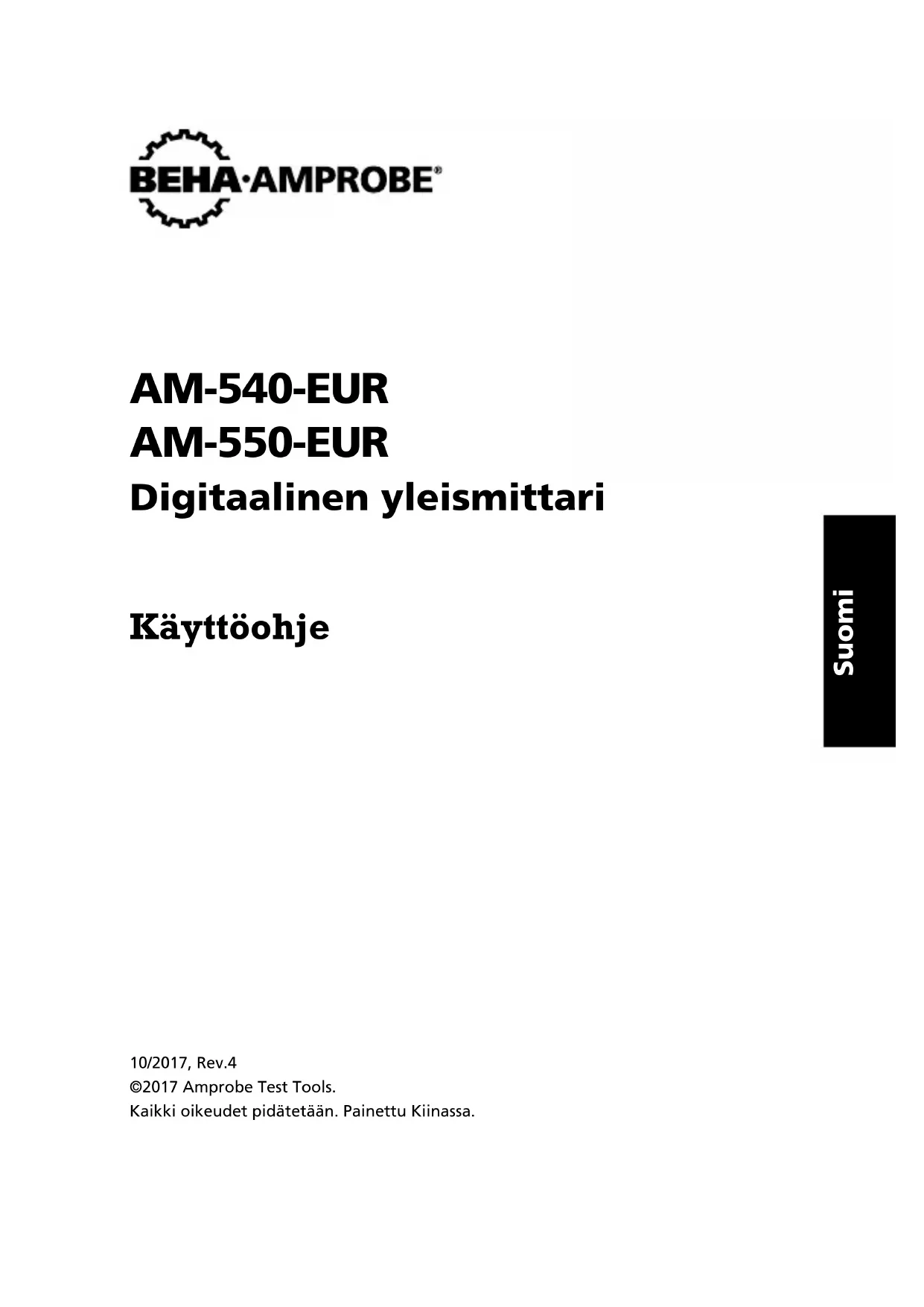 9V battery F2Suomi AM-540-EUR AM-550-EUR Digitaalinen yleismittari Käyttöohje 10/2017, Rev.4 ©2017 Amprobe Test Tools. Kaikki oikeudet pidätetään. Painettu Kiinassa.Rajoitettu takuu ja rajoitettu vastuu Tämän Amprobe-tuotteen taataan olevan vapaa raaka-aine ja valmistusvioista normaalisti käytettynä ja huollettuna. Amprobe AM-540-EUR:n ja AM-550-EUR:n takuu on yksi vuosi ja se alkaa ostopäivästä. Takuu ei koske sulakkeita, vaihdettavia paristoja tai mitään vikaa, joka on aiheutettu kun mittaria on käytetty väärin, muutettu, käsitelty huolimattomasti tai vioitettu tahallisesti tai epänormaalilla käytöllä/käsittelyllä. Jälleenmyyjillä ei ole oikeutta antaa laajempaa tai erilaista takuuta Amproben puolesta. Saadaksesi takuupalvelua, palauta tuote (ostokuitin kopion kera) lähimmälle Amprobe-jälleenmyyjälle. Katso tarkemmat tiedot kohdasta ”Huolto”. TÄMÄ TAKUU ON OSTAJAN AINOA JA YKSINOMAINEN KEINO JA SE KORVAA KAIKKI MUUT SUORAT TAI EPÄSUORAT TAKUUT. NIIHIN KUULUU, MUTTA EI RAJOITU, MIKÄ TAHANSA EPÄSUORA TAKUU KAUPATTAVUUDESTA TAI SOPIVUUDESTA TIETTYYN TARKOITUKSEEN. VALMISTAJA EI OLE KORVAUSVELVOLLINEN MISTÄÄN ERITYISISTÄ, EPÄSUORISTA, SATUNNAISISTA TAI SEURAAMUKSELLISISTA VAHINGOISTA TAI TAPPIOISTA, MUKAAN LUKIEN TIETOJEN KATOAMINEN, RIIPPUMATTA SIITÄ MISTÄ TAHANSA TEORIASTA NE JOHTUVAT. Jotkut valtiot eivät salli epäsuoran takuun rajoittamista tai seuraamuksellisten vahinkojen poissulkemista tai rajoittamista. Siksi tämän takuun rajoitukset ja poissulkemiset eivät ehkä koske kaikkia ostajia. Jos toimivaltainen tuomioistuin katsoo tämän takuun jonkin ehdon pätemättömäksi tai toimeenpanokelvottomaksi, ei sellainen päätös vaikuta minkään muun ehdon lainvoimaisuuteen tai toimeenpantavuuteen. Huolto Kaikissa mittalaitteissa jotka palautetaan jälleenmyyjälle takuuaikana tai sen jälkeen, tulee olla mukana seuraavat tiedot: Sinun nimesi, yrityksen nimi, osoite, puhelinnumero ja kopio ostokuitista. Lisää mukaan vielä vikakuvaus ongelmasta. Lähetä mittari Amprobe- jälleenmyyjällesi toimituskulut maksettuina (FOB määräasemalla). Valmistaja ei vastaa rikkoontumisvaarasta kuljetuksen aikana. Takuun alainen huolto Lue takuuohjeet ja tarkista paristo ennen mittalaitteen lähettämistä. Takuuaikana laite voidaan palauttaa Amprobe-jälleenmyyjälle vaihtoa varten. Huolto takuuajan umpeuduttua TOta yhteyttä Amprobe-jälleenmyyjään saadaksesi edullinen tarjous uudesta mittalaitteesta. Yhdysvallat: Kanada: Amprobe Amprobe Everett, WA 98203 Mississauga, ON L4Z 1X9 Puh: 877-AMPROBE (267-7623) Puh: 905-890-7600 Takuun piiriin kuulumattomat korjaukset ja vaihto - Eurooppa Takuun piiriin kuulumattomat laitteet voi vaihtaa Euroopassa Amprobe®:n jälleenmyyjällä nimellishintaan. Tarkista "Ostopaikat"-osasta www.amprobe.com-sivustolla lähellä sijaitsevat jakelijat. Postiosoite Euroopassa* Amprobe® Europe Beha-Amprobe GmbH In den Engematten 14 79286 Glottertal, Germany Puh: +49 (0) 7684 8009 - 0 www.amprobe.eu *(Vain kirjeenvaihtoa varten. Älä lähetä korjaus- tai vaihtopyyntöjä tähän osoitteeseen. Eurooppalaisia kuluttajia pyydetään ottamaan yhteyttä jälleenmyyjäänsä.)AM-540-EUR & AM-550-EUR Digitaalinen yleismittari