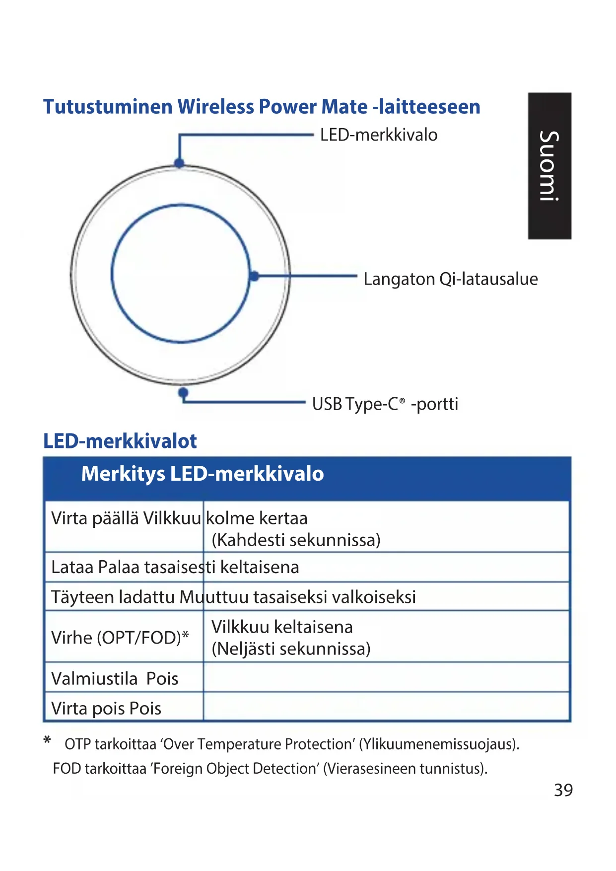 -portti LED-merkkivalot Merkitys LED-merkkivalo Virta päällä Vilkkuu kolme kertaa (Kahdesti sekunnissa) Lataa Palaa tasaisesti keltaisena Täyteen ladattu Muuttuu tasaiseksi valkoiseksi Virhe (OPT/FOD)* Vilkkuu keltaisena (Neljästi sekunnissa) Valmiustila Pois Virta pois Pois Langaton Qi-latausalue