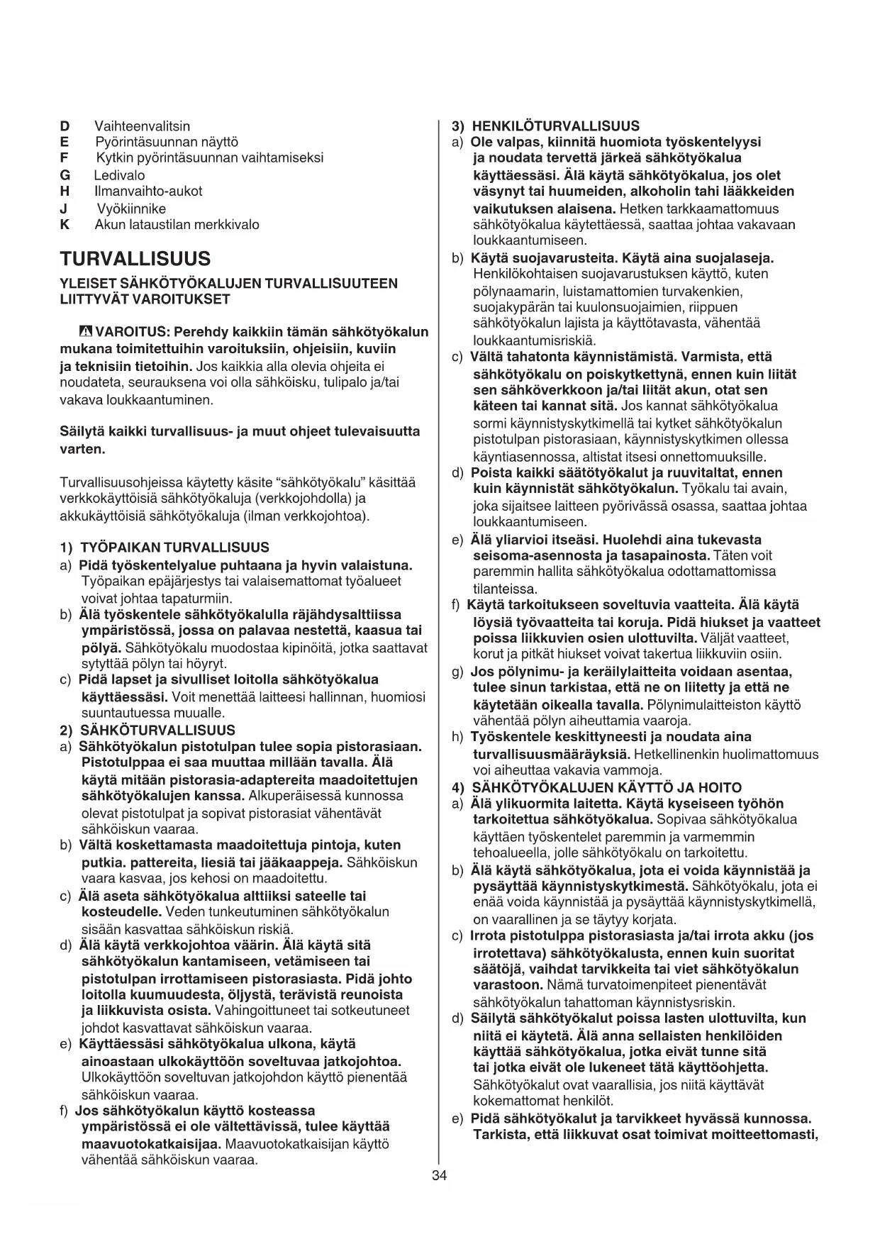 a) Älä ylikuormita laitetta. Käytä kyseiseen työhön tarkoitettua sähkötyökalua. Sopivaa sähkötyökalua käyttäen työskentelet paremmin ja varmemmin tehoalueella, jolle sähkötyökalu on tarkoitettu. b) Älä käytä sähkötyökalua, jota ei voida käynnistää ja pysäyttää käynnistyskytkimestä. Sähkötyökalu, jota ei enää voida käynnistää ja pysäyttää käynnistyskytkimellä, on vaarallinen ja se täytyy korjata. c) Irrota pistotulppa pistorasiasta ja/tai irrota akku (jos irrotettava) sähkötyökalusta, ennen kuin suoritat säätöjä, vaihdat tarvikkeita tai viet sähkötyökalun varastoon. Nämä turvatoimenpiteet pienentävät sähkötyökalun tahattoman käynnistysriskin. d) Säilytä sähkötyökalut poissa lasten ulottuvilta, kun niitä ei käytetä. Älä anna sellaisten henkilöiden käyttää sähkötyökalua, jotka eivät tunne sitä tai jotka eivät ole lukeneet tätä käyttöohjetta. Sähkötyökalut ovat vaarallisia, jos niitä käyttävät kokemattomat henkilöt. e) Pidä sähkötyökalut ja tarvikkeet hyvässä kunnossa. Tarkista, että liikkuvat osat toimivat moitteettomasti, D Vaihteenvalitsin E Pyörintäsuunnan näyttö F Kytkin pyörintäsuunnan vaihtamiseksi G Ledivalo H Ilmanvaihto-aukot J Vyökiinnike K Akun lataustilan merkkivalo TURVALLISUUS