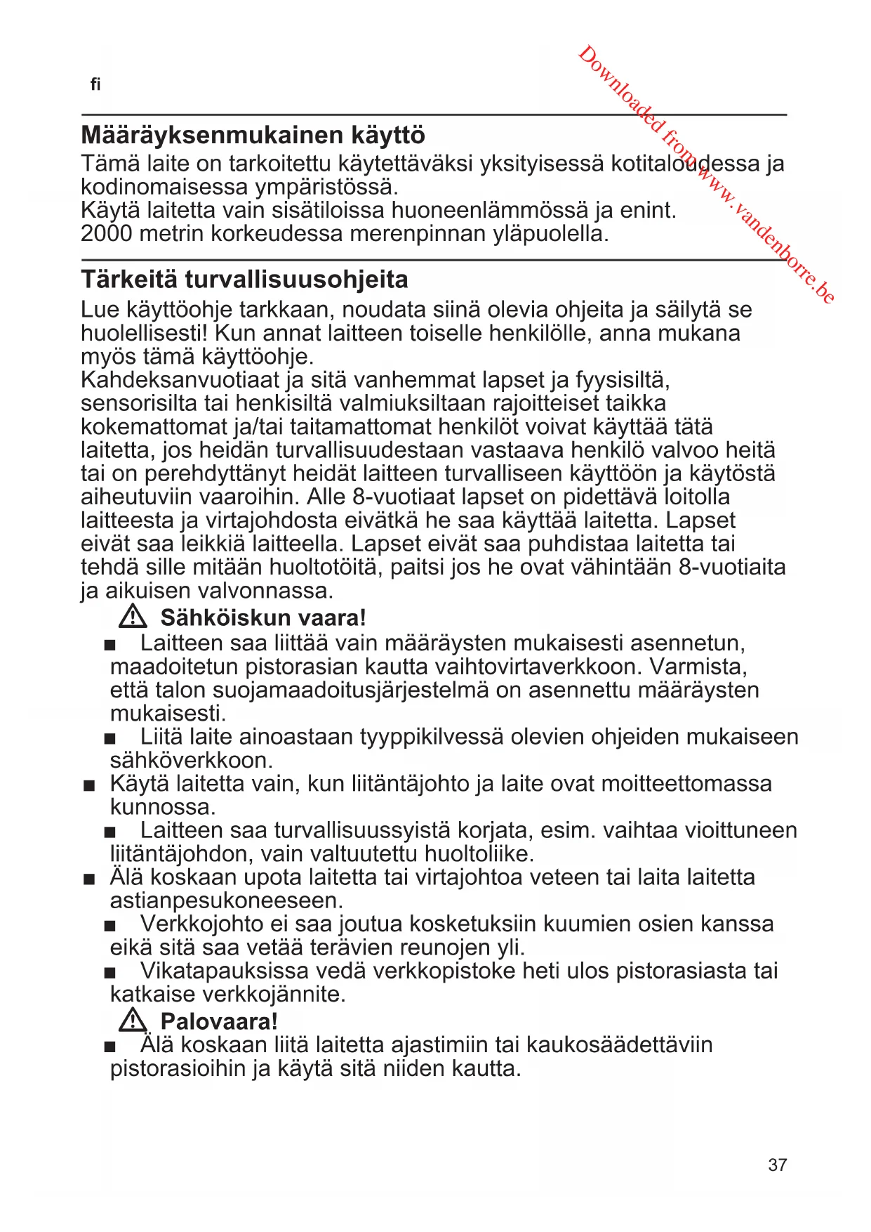 Määräyksenmukainen käyttö Tämä laite on tarkoitettu käytettäväksi yksityisessä kotitaloudessa ja kodinomaisessa ympäristössä. Käytä laitetta vain sisätiloissa huoneenlämmössä ja enint. 2000 metrin korkeudessa merenpinnan yläpuolella. Tärkeitä turvallisuusohjeita Lue käyttöohje tarkkaan, noudata siinä olevia ohjeita ja säilytä se huolellisesti! Kun annat laitteen toiselle henkilölle, anna mukana myös tämä käyttöohje. Kahdeksanvuotiaat ja sitä vanhemmat lapset ja fyysisiltä, sensorisilta tai henkisiltä valmiuksiltaan rajoitteiset taikka kokemattomat ja/tai taitamattomat henkilöt voivat käyttää tätä laitetta, jos heidän turvallisuudestaan vastaava henkilö valvoo heitä tai on perehdyttänyt heidät laitteen turvalliseen käyttöön ja käytöstä aiheutuviin vaaroihin. Alle 8-vuotiaat lapset on pidettävä loitolla laitteesta ja virtajohdosta eivätkä he saa käyttää laitetta. Lapset eivät saa leikkiä laitteella. Lapset eivät saa puhdistaa laitetta tai tehdä sille mitään huoltotöitä, paitsi jos he ovat vähintään 8-vuotiaita ja aikuisen valvonnassa. W Sähköiskun vaara! ■ Laitteen saa liittää vain määräysten mukaisesti asennetun, maadoitetun pistorasian kautta vaihtovirtaverkkoon. Varmista, että talon suojamaadoitusjärjestelmä on asennettu määräysten mukaisesti. ■ Liitä laite ainoastaan tyyppikilvessä olevien ohjeiden mukaiseen sähköverkkoon. ■ Käytä laitetta vain, kun liitäntäjohto ja laite ovat moitteettomassa kunnossa. ■ Laitteen saa turvallisuussyistä korjata, esim. vaihtaa vioittuneen liitäntäjohdon, vain valtuutettu huoltoliike. ■ Älä koskaan upota laitetta tai virtajohtoa veteen tai laita laitetta astianpesukoneeseen. ■ Verkkojohto ei saa joutua kosketuksiin kuumien osien kanssa eikä sitä saa vetää terävien reunojen yli. ■ Vikatapauksissa vedä verkkopistoke heti ulos pistorasiasta tai katkaise verkkojännite. W Palovaara! ■ Älä koskaan liitä laitetta ajastimiin tai kaukosäädettäviin pistorasioihin ja käytä sitä niiden kautta. Downloaded from www.vandenborre.be38