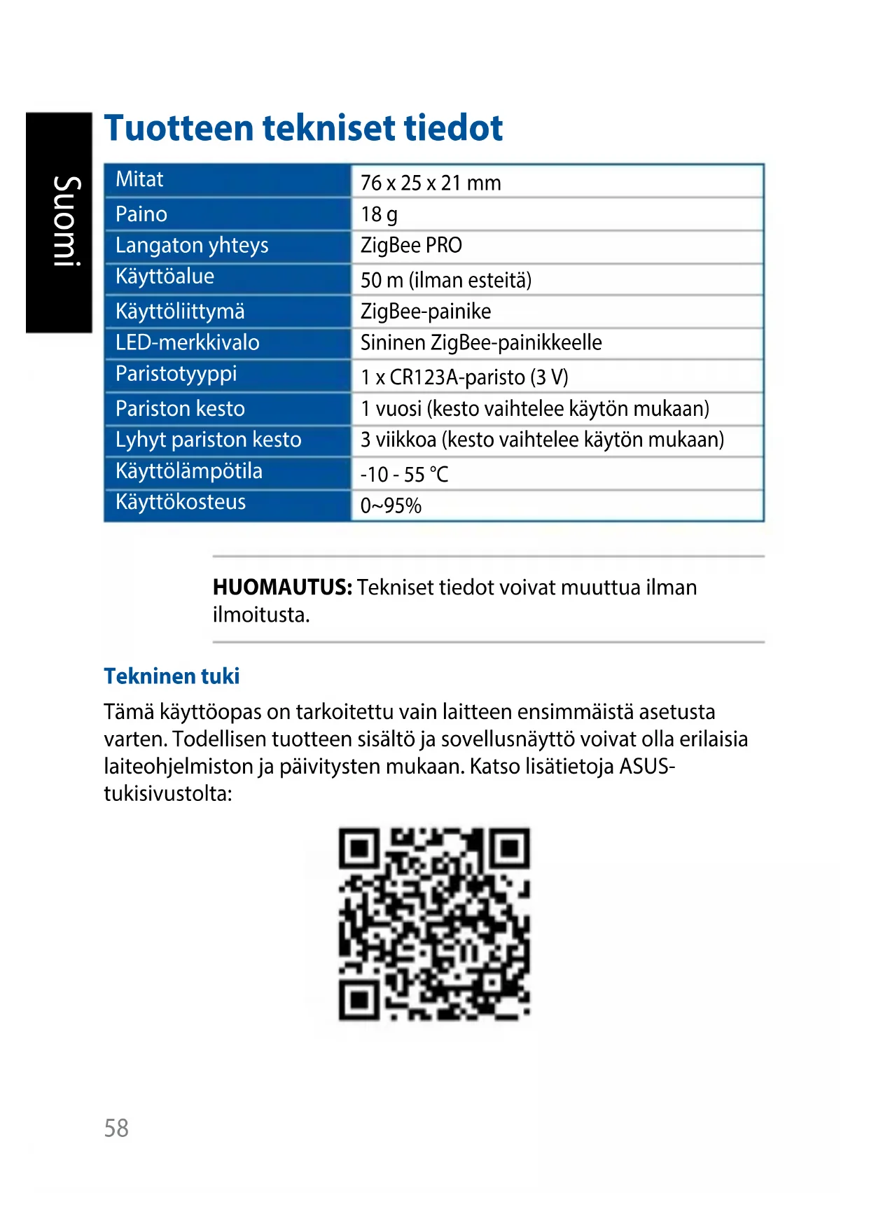 NorskSuomi Tuotteen tekniset tiedot Mitat 76 x 25 x 21 mm Paino 18 g Langaton yhteys ZigBee PRO Käyttöalue 50 m (ilman esteitä) Käyttöliittymä ZigBee-painike LED-merkkivalo Sininen ZigBee-painikkeelle Paristotyyppi 1 x CR123A-paristo (3 V) Pariston kesto 1 vuosi (kesto vaihtelee käytön mukaan) Lyhyt pariston kesto 3 viikkoa (kesto vaihtelee käytön mukaan) Käyttölämpötila -10 - 55 °C Käyttökosteus 0~95% HUOMAUTUS: Tekniset tiedot voivat muuttua ilman ilmoitusta. Tekninen tuki Tämä käyttöopas on tarkoitettu vain laitteen ensimmäistä asetusta varten. Todellisen tuotteen sisältö ja sovellusnäyttö voivat olla erilaisia laiteohjelmiston ja päivitysten mukaan. Katso lisätietoja ASUS- tukisivustolta: 58Suomi Tuotteen yleiskatsaus Lämpötila- ja kosteusanturi Mittaa sisälämpötilan (-10 - 55 °C) ja kosteuden (0 - 95 %). ZigBee-painike Paina muodostaaksesi yhteyden kotiyhdyskäytävällä. Pidä painettuna 5 sekuntia nollataksesi laitteen. HUOMAUTUS: Varmista, että nollaat ASUS Smart Home -laitteen ja poistat laitteen kumppanisovelluksen poistaaksesi sen pysyvästi. 59Suomi ZigBee LED -merkkivalo Katso seuraavasta taulukosta tiedot LED-tilamerkkivaloista: Väri Tila Kuvaus Tasaisen sininen Laite käynnistyy Palaa 1 sekunnin Yhteyden katkaiseminen kotiyhdyskäytävällä Pidä ZigBee-painiketta painettuna 5 sekuntia. Laitteen yksilöinti Palaa 5 sekuntia Vilkkuva sininen Muodostetaan yhteyttä kotiyhdyskäytävällä Paina ZigBee-painiketta muodostaaksesi yhteyden kotiyhdyskäytävällä 60Suomi Järjestelmävaatimukset