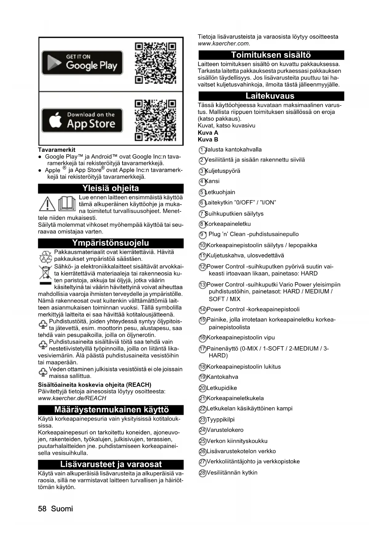 ovat Apple Inc:n tavaramerk- kejä tai rekisteröityjä tavaramerkkejä. Yleisiä ohjeita Lue ennen laitteen ensimmäistä käyttöä tämä alkuperäinen käyttöohje ja muka- na toimitetut turvallisuusohjeet. Menet- tele niiden mukaisesti. Säilytä molemmat vihkoset myöhempää käyttöä tai seu- raavaa omistajaa varten. Ympäristönsuojelu Pakkausmateriaalit ovat kierrätettäviä. Hävitä pakkaukset ympäristöä säästäen. Sähkö- ja elektroniikkalaitteet sisältävät arvokkai- ta kierrätettäviä materiaaleja tai rakenneosia ku- ten paristoja, akkuja tai öljyjä, jotka väärin käsiteltyinä tai väärin hävitettyinä voivat aiheuttaa mahdollisia vaaroja ihmisten terveydelle ja ympäristölle. Nämä rakenneosat ovat kuitenkin välttämättömiä lait- teen asianmukaisen toiminnan vuoksi. Tällä symbolilla merkittyjä laitteita ei saa hävittää kotitalousjätteenä. Puhdistustöitä, joiden yhteydessä syntyy öljypitois- ta jätevettä, esim. moottorin pesu, alustapesu, saa tehdä vain pesupaikoilla, joilla on öljynerotin. Puhdistusaineita sisältäviä töitä saa tehdä vain nestetiivistetyillä työpinnoilla, joilla on liitäntä lika- vesiviemäriin. Älä päästä puhdistusaineita vesistöihin tai maaperään. Veden ottaminen julkisista vesistöistä ei ole joissain maissa sallittua. Sisältöaineita koskevia ohjeita (REACH) Päivitettyjä tietoja ainesosista löytyy osoitteesta: www.kaercher.de/REACH Määräystenmukainen käyttö Käytä korkeapainepesuria vain yksityisissä kotitalouk- sissa. Korkeapainepesuri on tarkoitettu koneiden, ajoneuvo- jen, rakenteiden, työkalujen, julkisivujen, terassien, puutarhalaitteiden jne. puhdistamiseen korkeapainei- sella vesisuihkulla. Lisävarusteet ja varaosat Käytä vain alkuperäisiä lisävarusteita ja alkuperäisiä va- raosia, sillä ne varmistavat laitteen turvallisen ja häiriöt- tömän käytön. Tietoja lisävarusteista ja varaosista löytyy osoitteesta www.kaercher.com. Toimituksen sisältö Laitteen toimituksen sisältö on kuvattu pakkauksessa. Tarkasta laitetta pakkauksesta purkaessasi pakkauksen sisällön täydellisyys. Jos lisävarusteita puuttuu tai ha- vaitset kuljetusvahinkoja, ilmoita tästä jälleenmyyjälle. Laitekuvaus Tässä käyttöohjeessa kuvataan maksimaalinen varus- tus. Mallista riippuen toimituksen sisällössä on eroja (katso pakkaus). Kuvat, katso kuvasivu Kuva A Kuva B 1 Jalusta kantokahvalla 2 Vesiliitäntä ja sisään rakennettu siivilä 3 Kuljetuspyörä 4 Kansi 5 Letkuohjain 6 Laitekytkin ”0/OFF” / ”I/ON” 7 Suihkuputkien säilytys 8 Korkeapaineletku 9 * Plug ’n’ Clean -puhdistusainepullo 10 Korkeapainepistoolin säilytys / lepopaikka 11 Kuljetuskahva, ulosvedettävä 12 Power Control -suihkuputken pyörivä suutin vai- keasti irtoavaan likaan, painetaso: HARD 13 Power Control -suihkuputki Vario Power yleisimpiin puhdistustöihin, painetasot: HARD / MEDIUM / SOFT / MIX 14 Power Control -korkeapainepistooli 15 Painike, jolla irrotetaan korkeapaineletku korkea- painepistoolista 16 Korkeapainepistoolin vipu 17 Painenäyttö (0-MIX / 1-SOFT / 2-MEDIUM / 3- HARD) 18 Korkeapainepistoolin lukitus 19 Kantokahva 20 Letkupidike 21 Korkeapaineletkukela 22 Letkukelan käsikäyttöinen kampi 23 Tyyppikilpi 24 Varustelokero 25 Verkon kiinnityskoukku 26 Lisävarustekotelon verkko 27 Verkkoliitäntäjohto ja verkkopistoke 28 Vesiliitännän kytkinSuomi 59 29 **Puutarhaletku (kangasvahvistettu, halkaisija vä- hintään 1/2" (13 mm), pituus vähintään 7,5 m, kau- pallisesti saatavana olevalla pikaliittimellä) 30 **KÄRCHER-imuletku vedensyöttöön avoimista säiliöistä (tilausnumero 2.643-100) 31 Mukana toimitetut ruuvit ja tapit *vaaditaan lisäksi Mukana toimitetut ruuvit ja tapit Kuva C 1 Jalustan tappi (2 kpl) 2 Ruuvi 4x22 (2 kpl) 3 Ruuvi 4x16 (10 kpl) Turvalaitteet 몇 VAROITUS Loukkaantumisvaara! Vakavia vammoja puuttuvien, muunneltujen tai tehotto- mien turvalaitteiden johdosta. Turvalaitteita ei saa ohittaa tai poistaa, tai tehdä niitä te- hottomiksi. Turvalaitteet ovat sinun turvallisuuttasi var- ten. Laitekytkin Laitekytkin estää laitteen tahattoman käytön. Korkeapainepistoolin lukitus Lukitus lukitsee korkeapainepistoolin vivun ja estää lait- teen tahattoman käynnistämisen. Automaattinen pysäytystoiminto Kun korkeapainepistoolin vipu vapautetaan, painekytkin kytkee pumpun pois päältä ja korkeapainesuihku lop- puu. Kun vipua taas painetaan, pumppu käynnistyy. Moottorin suojakytkin Jos virrankulutus on liian suuri, moottorin suojakytkin kytkee laitteen pois päältä. Laitteessa olevat symbolit Asennus Kuvat, katso kuvasivu. Asenna irrallaan toimitetut osat laitteeseen ennen käyt- töönottoa. Varaa saataville mukana toimitetut ruuvit ja niihin sopiva ruuvitaltta. Pyörien asentaminen