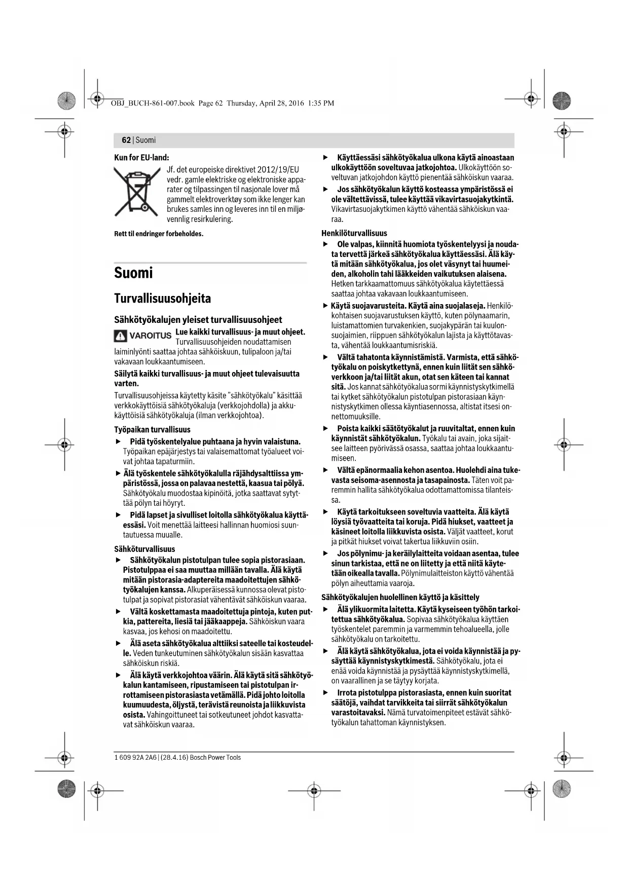 Paino vastaa EPTA-Procedure 01:2014 kg 2,7 Suojausluokka /II Tiedot koskevat 230 V nimellisjännitettä [U]. Poikkeavilla jännitteillä ja maakohtaisissa malleissa nämä tiedot voivat vaihdella. OBJ_BUCH-861-007.book Page 64 Thursday, April 28, 2016 1:35 PMSuomi | 65 Bosch Power Tools 1 609 92A 2A6 | (28.4.16) Työkalunvaihto Pölynsuojus 2 estää pitkälti poranpölyn tunkeutumisen työka- lunpitimeen käytön aikana. Varo työkaluja vaihdettaessa, et- tei pölynsuojus 2 vaurioidu. Vaurioitunut pölynsuojus on heti vaihdettava. Suosit- telemme, että tämä työ jätetään asiakaspalvelun suori- tettavaksi. SDS-plus-vaihtotyökalujen asennus (katso kuva D) SDS-plus-istukalla voit yksinkertaisesti ja kätevästi vaihtaa vaihtotyökalut ilman lisätyökaluja. – Puhdista vaihtotyökalun istukkaan tuleva varsi ennen asennusta ja rasvaa sitä kevyesti. – Aseta vaihtotyökalu kiertäen työkalunpitimeen, kunnes se lukkiutuu itsestään. – Tarkista lukkiutuminen työkalusta vetämällä. SDS-plus-vaihtotyökalu liikkuu järjestelmästä johtuen va- paasti. Täten syntyy tyhjäkäynnillä pyörintäheitto. Tämä ei vaikuta porausreiän tarkkuuteen, koska poranterä keskittää itsensä porauksen aikana. SDS-plus-vaihtotyökalujen irrotus (katso kuvaE) – Työnnä lukkoholkki 3 taaksepäin ja poista vaihtotyökalu. Vaihtotyökalujen kiinnitys ilman SDS-plus-järjestelmää Huomio: Älä käytä työkaluja, joissa ei ole SDS-plus-kiinnitys- tä vasaraporaukseen tai talttaukseen! Työkalut, ilman SDS- plus-kiinnitystä ja niiden istukat vaurioituvat vasaraporauk- sessa ja talttauksessa. – Asenna hammaskehäistukka 14 (katso ”Hammaskehäistu- kan vaihto”, sivu 64). – Avaa hammaskehäistukka 14 kiertämällä sitä, kunnes työ- kalu voidaan asettaa siihen. Aseta työkalu. – Työnnä istukka-avain hammaskehäistukan 14 vastaaviin reikiin ja kiristä työkalu tasaisesti kiinni. – Kierrä isku-/kiertopysäytyskytkin 9 asentoon ”poraus”. Vaihtotyökalujen irrotus ilman SDS-plus-järjestelmää – Kierrä hammaskehäistukan 14 rengasta vastapäivään istu- kan avaimella, kunnes vaihtotyökalu voidaan poistaa työ- kalunpitimestä. Pölyn imu käyttäen imuvartta (Saugfix) (lisätar- vike) Materiaalien, kuten lyijypitoisen pinnoitteen, muutamien puulaatujen, kivennäispölyt ja metallipölyt voivat olla ter- veydelle vaarallisia. Pölyn kosketus tai hengitys saattaa ai- heuttaa käyttäjälle tai lähellä oleville henkilöille allergisia reaktioita ja/tai hengitystiesairauksia. Määrättyjä pölyjä, kuten tammen- tai pyökinpölyä pidetään karsinogeenisina, eritoten yhdessä puukäsittelyssä käy- tettyjen lisäaineiden kanssa (kromaatti, puunsuoja-aine). Asbestipitoisia aineita saavat käsitellä vain ammattilaiset. – Käytä materiaalille soveltuvaa pölynimua, jos se on mahdollista. – Huolehdi työkohteen hyvästä tuuletuksesta. – Suosittelemme käyttämään suodatusluokan P2 hengi- tyssuojanaamaria. Ota huomioon maassasi voimassaolevat säännökset koski- en käsiteltäviä materiaaleja. Vältä pölynkertymää työpaikalla. Pöly saattaa helposti syttyä palamaan. Imuvarren asennus (katso kuva F) Pölyn imuun tarvitaan imuvarsi (lisätarvike). Porattaessa imu- varsi joustaa takaisin niin, että imuvarren pää aina pysyy tii- viisti alustaa vasten. – Paina syvyydenrajoittimen säätöpainiketta 10 ja poista sy- vyydenrajoitin 11. Paina painiketta 10 uudelleen ja aseta imuvarsi edestä lisäkahvaan 12. – Liitä imuletku (halkaisija 19 mm, lisätarvike) imuvarren aukkoon 16. Pölynimurin tulee soveltua työstettävälle materiaalille. Käytä erikoisimuria terveydelle erityisen vaarallisten, karsino- geenisten tai kuivien pölyjen imurointiin. Poraussyvyyden asetus imuvarteen (katso kuva G) Voit määritellä halutun poraussyvyyden X myös imuvarren ol- lessa asennettuna. – Työnnä SDS-plus-vaihtotyökalu vasteeseen asti SDS-plus- työkalunpitimeen 1. SDS-plus-työkalun liikkuminen saat- taa muuten johtaa väärän poraussyvyyden asetukseen. – Avaa imuvarressa oleva siipiruuvi 20. – Aseta sähkötyökalu tiukasti porattavaa kohtaa vasten, käynnistämättä konetta. SDS-plus-vaihtotyökalun tulee tällöin tukea pintaan. – Siirrä imuvarren johdeputki 21 pidikkeessään niin, että imuvarren pää tukee porattavaan pintaan. Älä työnnä joh- deputkea 21 kauemmas teleskooppiputkeen 19, kuin on tarvetta, jotta mahdollisimman suuri osa teleskooppiput- ken 19 asteikosta jää näkyviin. – Kiristä siipiruuvi 20 uudelleen. Avaa imuvarren syvyyden- rajoittimessa oleva kiristysruuvi 17. – Siirrä syvyydenrajoitin 18 teleskooppiputkessa 19 niin, et- tä kuvassa näkyvä etäisyys X vastaa haluamasi poraussy- vyyttä. – Kiristä kiristysruuvi 17 tässä asennossa. Käyttö Käyttöönotto Ota huomioon verkkojännite! Virtalähteen jännitteen tulee vastata laitteen tyyppikilvessä olevia tietoja. 230 V merkittyjä laitteita voidaan käyttää myös 220 V verkoissa. Käyttömuodon asetus Valitse sähkötyökalun toimintamuoto isku-/kiertopysäytys- kytkimellä 9. Huomio: Toimintamuodon muutos on sallittu vain sähkötyö- kalun ollessa poiskytkettynä! Muussa tapauksessa sähkötyö- kalu saattaa vaurioitua. – Muuta toimintamuoto painamalla lukkopainiketta 8 ja kier- tämällä poraus/vasaraporaus vaihtokytkin 9 haluttuun asentoon kuuluvaan lukkiutumiseen asti. OBJ_BUCH-861-007.book Page 65 Thursday, April 28, 2016 1:35 PM66 | Suomi 1 609 92A 2A6 | (28.4.16) Bosch Power Tools Pyörimissuunnan asetus Suunnanvaihtokytkimellä 4 voit muuttaa sähkötyökalun kier- tosuunnan. Käynnistyskytkimen 6 ollessa painettuna tämä ei kuitenkaan ole mahdollista. Kierto oikealle: Kierrä suunnanvaihtokytkin 4 kummalla- kin puolella vasteeseen asti asentoon . Kierto vasemmalle: Kierrä suunnanvaihtokytkin 4 kum- mallakin puolella vasteeseen asti asentoon . Aseta aina kiertosuunta oikealle vasaraporausta, porausta ja talttausta varten. Käynnistys ja pysäy