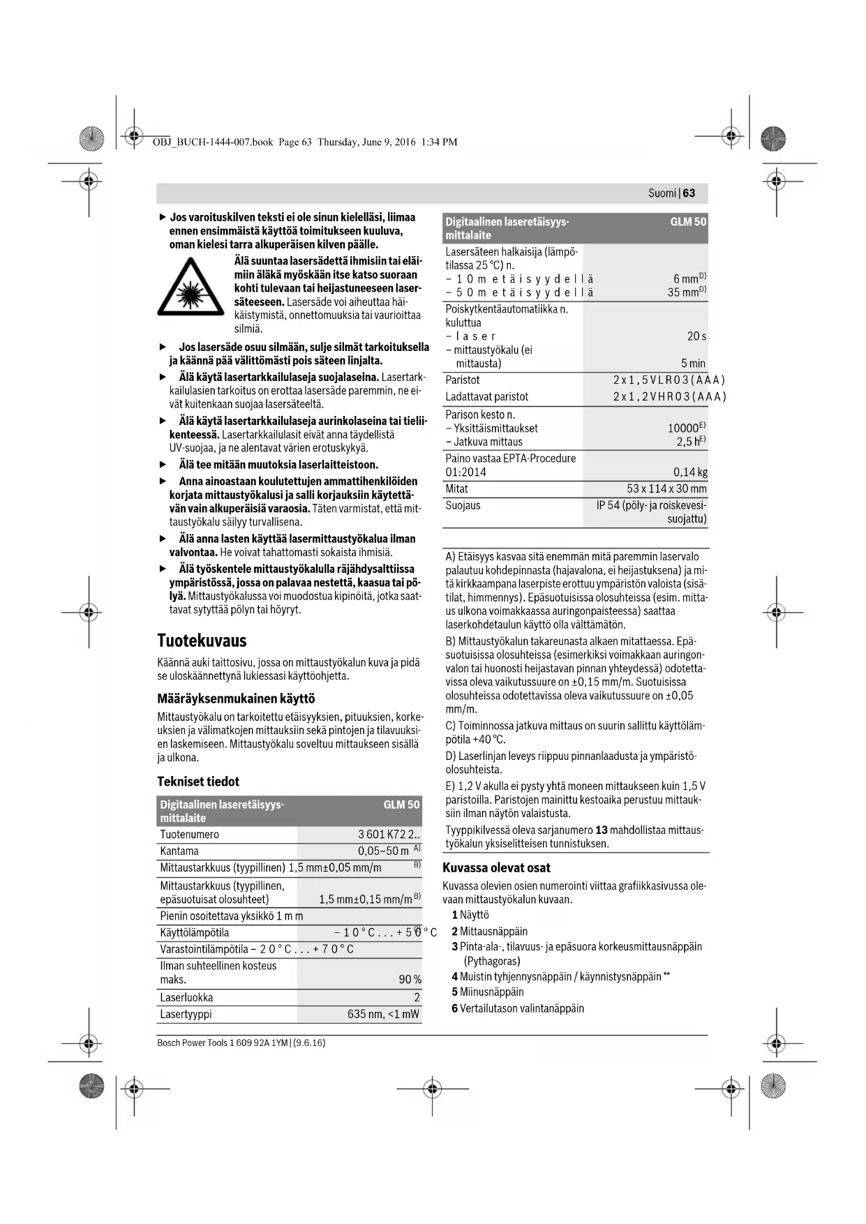 OBJ_BUCH-1444-007.book Page 62 Thursday, June 9, 2016 1:34 PMSuomi | 63 Bosch Power Tools 1 609 92A 1YM | (9.6.16) Jos varoituskilven teksti ei ole sinun kielelläsi, liimaa ennen ensimmäistä käyttöä toimitukseen kuuluva, oman kielesi tarra alkuperäisen kilven päälle. Älä suuntaa lasersädettä ihmisiin tai eläi- miin äläkä myöskään itse katso suoraan kohti tulevaan tai heijastuneeseen laser- säteeseen. Lasersäde voi aiheuttaa häi- käistymistä, onnettomuuksia tai vaurioittaa silmiä. Jos lasersäde osuu silmään, sulje silmät tarkoituksella ja käännä pää välittömästi pois säteen linjalta. Älä käytä lasertarkkailulaseja suojalaseina. Lasertark- kailulasien tarkoitus on erottaa lasersäde paremmin, ne ei- vät kuitenkaan suojaa lasersäteeltä. Älä käytä lasertarkkailulaseja aurinkolaseina tai tielii- kenteessä. Lasertarkkailulasit eivät anna täydellistä UV-suojaa, ja ne alentavat värien erotuskykyä. Älä tee mitään muutoksia laserlaitteistoon. Anna ainoastaan koulutettujen ammattihenkilöiden korjata mittaustyökalusi ja salli korjauksiin käytettä- vän vain alkuperäisiä varaosia. Täten varmistat, että mit- taustyökalu säilyy turvallisena. Älä anna lasten käyttää lasermittaustyökalua ilman valvontaa. He voivat tahattomasti sokaista ihmisiä. Älä työskentele mittaustyökalulla räjähdysalttiissa ympäristössä, jossa on palavaa nestettä, kaasua tai pö- lyä. Mittaustyökalussa voi muodostua kipinöitä, jotka saat- tavat sytyttää pölyn tai höyryt. Tuotekuvaus Käännä auki taittosivu, jossa on mittaustyökalun kuva ja pidä se uloskäännettynä lukiessasi käyttöohjetta. Määräyksenmukainen käyttö Mittaustyökalu on tarkoitettu etäisyyksien, pituuksien, korke- uksien ja välimatkojen mittauksiin sekä pintojen ja tilavuuksi- en laskemiseen. Mittaustyökalu soveltuu mittaukseen sisällä ja ulkona. Tekniset tiedot Kuvassa olevat osat Kuvassa olevien osien numerointi viittaa grafiikkasivussa ole- vaan mittaustyökalun kuvaan. 1 Näyttö 2 Mittausnäppäin 3 Pinta-ala-, tilavuus- ja epäsuora korkeusmittausnäppäin (Pythagoras) 4 Muistin tyhjennysnäppäin / käynnistysnäppäin ** 5 Miinusnäppäin 6 Vertailutason valintanäppäin Digitaalinen laseretäisyys- mittalaite GLM 50 Tuotenumero 3 601 K72 2.. Kantama 0,05–50 m