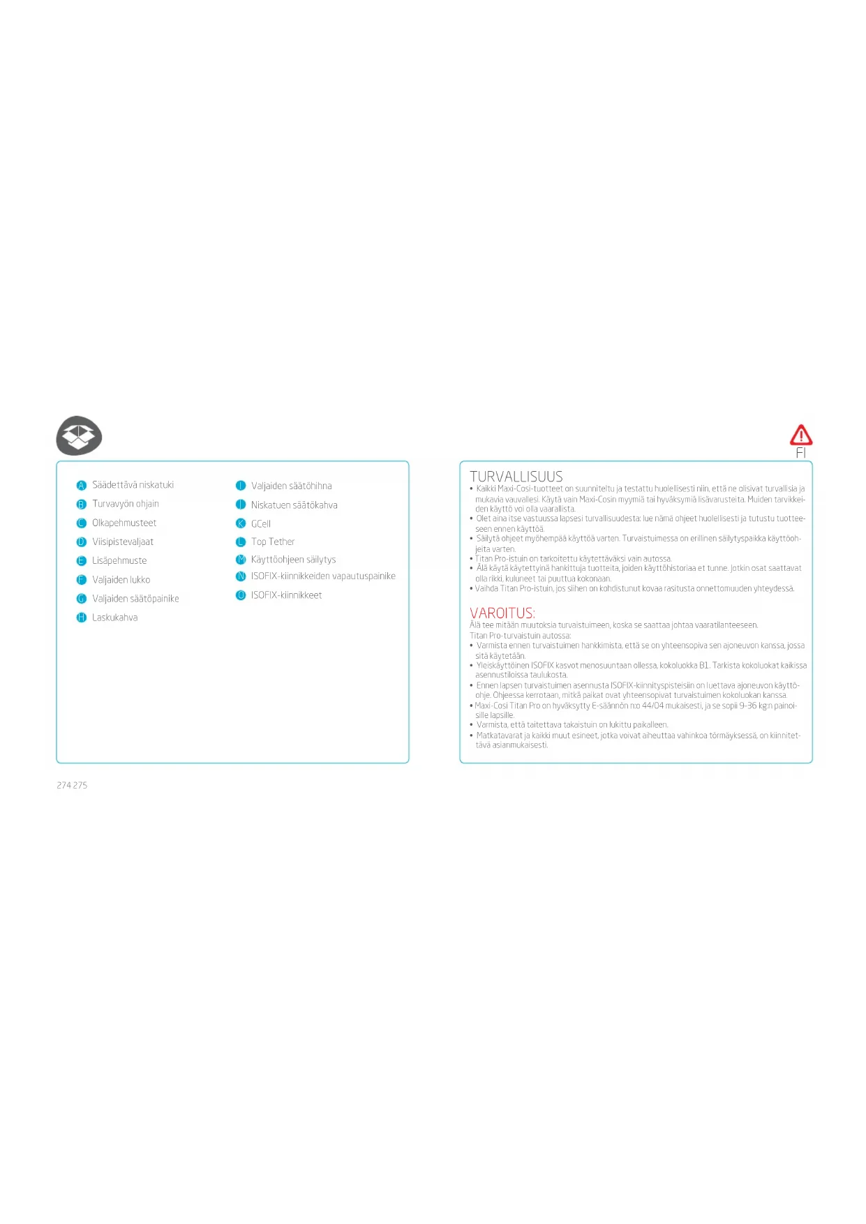 - Jos jokin järjestelmän asianmukaisessa asennuksessa tai käytössä on epäselvää, käyttäjän on hyvä ottaa yhteys lapsen turvalaitejärjestelmän jälleenmyyjään tai valmistajaan. HOITO Pidä turvaistuin puhtaana. Älä käytä voiteluaineita tai voimakkaita puhdistusaineita. Lisäpehmuste: Titan Pro-istuimen mukana toimitettava lisäpehmuste on keskeinen turvalaitteen toiminnan kannalta 45–60cm pitkille ja 9–18kg:n painoisille lapsille (ryhmä 1). Pehmuste voidaan irrottaa ja suojus voidaan poistaa pesua varten, mutta on erittäin tärkeää, että se asetetaan takaisin paikoil- leen ja että vain tätä virallista Maxi-Cosi Titan Pro -lisäpehmustetta käytetään. Lisäpehmuste on tarkoitettu käytettäväksi ainoastaan Titan Pro-istuimen kanssa. Kangas: