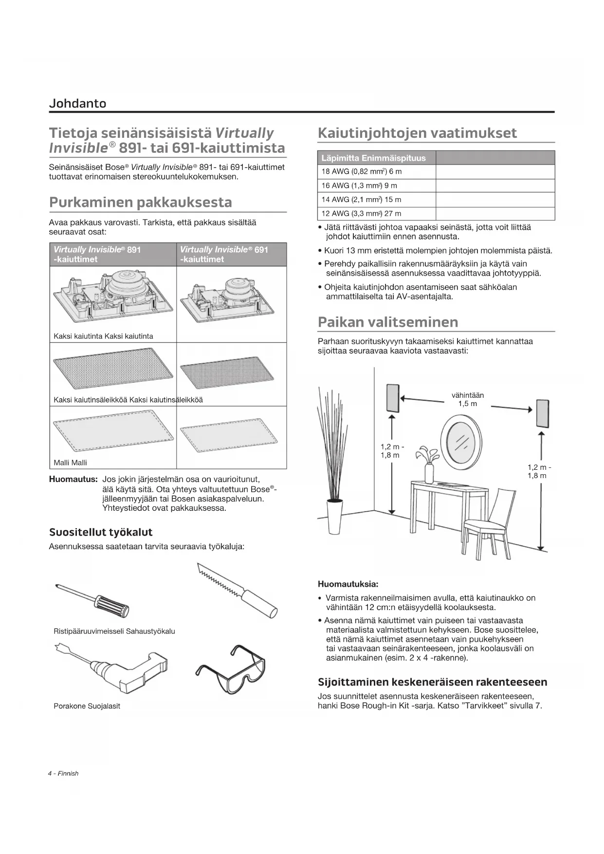 jälleenmyyjään tai Bosen asiakaspalveluun. Yhteystiedot ovat pakkauksessa. Suositellut työkalut Asennuksessa saatetaan tarvita seuraavia työkaluja: Ristipääruuvimeisseli SahaustyökaluPorakone Suojalasit Kaiutinjohtojen vaatimukset Läpimitta Enimmäispituus 18 AWG (0,82 mm ) 6 m16 AWG (1,3 mm ) 9 m14 AWG (2,1 mm ) 15 m 12 AWG (3,3 mm ) 27 m