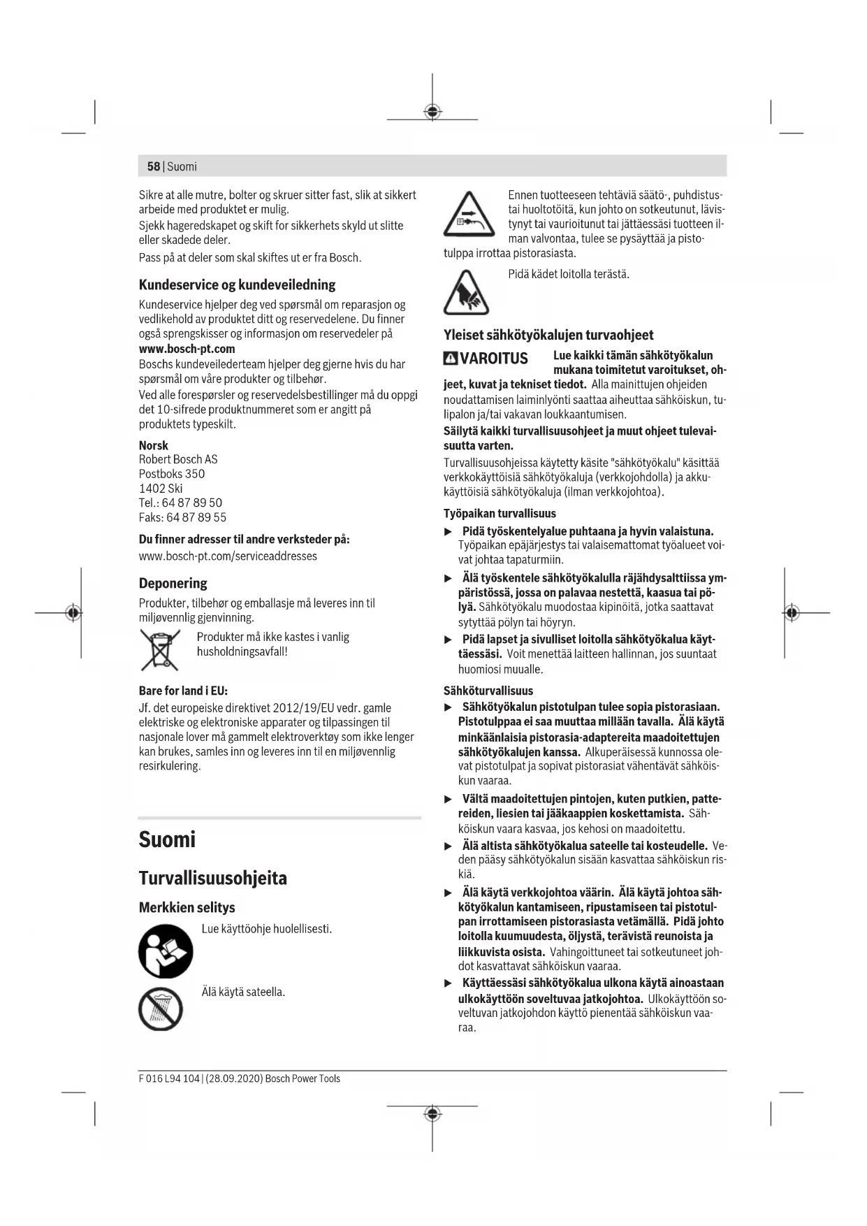Betjening u Ta hensyn til nettspenningen! Spenningen til strømkilden må stemme overens med angivelsene på redskapets typeskilt. Inn-/utkobling (se bilder C og D) For innkobling trykker du først på sperren (3) og holder denne trykt inne. Trykk deretter på av/på-bryteren (2) og hold den trykt inne. For utkobling slipper du sperren (3) og deretter på-/av- bryteren (2). Arbeide med hekksaksen (se bildeE) Beveg hekksaksen jevnt fremover på klippelinjen. Den dobbelte knivbjelken muliggjør skjæring i begge retningen eller med pendelbevegelser fra den ene siden til den andre. Klipp først sidene på hekken, så overkanten. For å få sidene rette, anbefaler vi å klippe i vokseretningen nedenfra og oppover. Hvis det klippes ovenfra og nedover, beveger de tynnere grenene seg utover, slik at det kan oppstå tynne steder eller hull. For til slutt å klippe overkanten rett, lønner det seg å spenne en snor i nødvendig høyde over hele hekkens lengde. Pass på at du ikke klipper gjenstander som f.eks. ståltråder. Kniver eller drivverk kan bli skadet. Feilsøking Symptom Mulig årsak Løsning Hekksaksen går ikke Nettspenningen finnes ikke Sjekk og slå på Stikkontakt er defekt Bruk en annen stikkkontakt Nettkabel skadet Kontroller nettkabel og oppsøk kundeservice hvis den er skadet Skjøteledning er skadet Sjekk skjøteledningen og skift den ut hvis den er skadet Sikringen er utløst Utskifting av sikringen Hekksaksen går rykkvis Intern kabling i hageredskapet er defekt Ta kontakt med kundeservice På-/av-bryter defekt Ta kontakt med kundeservice Motoren går, knivene står stille Intern feil Ta kontakt med kundeservice Knivene blir varme Kniven er butt Få knivbjelken slipt Hakk i kniven Få knivbjelken kontrollert For sterk friksjon på grunn av manglende smøring Sprøyt med smøreolje Sterke vibrasjoner/ lyder Defekt hageredskap Ta kontakt med kundeservice Service og vedlikehold Vedlikehold, rengjøring og lagring u Før alle arbeider på produktet utføres må støpselet trekkes ut av stikkontakten. u Hold produktet rent slik at du kan arbeide godt og sikkert. Sett ikke andre gjenstander på hageredskapet. Hold selve produktet og ventilasjonsspaltene alltid rene, for å kunne arbeide bra og sikkert. Sprøyt aldri vann på produktet. Dypp produktet aldri ned i vann. Produktet må oppbevares på et sikkert sted, tørt og utilgjengelig for barn. Sett ikke andre gjenstander på produktet. Bosch Power Tools F 016 L94 104 | (28.09.2020)58 | Suomi Sikre at alle mutre, bolter og skruer sitter fast, slik at sikkert arbeide med produktet er mulig. Sjekk hageredskapet og skift for sikkerhets skyld ut slitte eller skadede deler. Pass på at deler som skal skiftes ut er fra Bosch. Kundeservice og kundeveiledning Kundeservice hjelper deg ved spørsmål om reparasjon og vedlikehold av produktet ditt og reservedelene. Du finner også sprengskisser og informasjon om reservedeler på www.bosch-pt.com Boschs kundeveilederteam hjelper deg gjerne hvis du har spørsmål om våre produkter og tilbehør. Ved alle forespørsler og reservedelsbestillinger må du oppgi det 10‑sifrede produktnummeret som er angitt på produktets typeskilt. Norsk Robert Bosch AS Postboks 350 1402 Ski Tel.: 64 87 89 50 Faks: 64 87 89 55 Du finner adresser til andre verksteder på: www.bosch-pt.com/serviceaddresses Deponering Produkter, tilbehør og emballasje må leveres inn til miljøvennlig gjenvinning. Produkter må ikke kastes i vanlig husholdningsavfall! Bare for land i EU: Jf. det europeiske direktivet 2012/19/EU vedr. gamle elektriske og elektroniske apparater og tilpassingen til nasjonale lover må gammelt elektroverktøy som ikke lenger kan brukes, samles inn og leveres inn til en miljøvennlig resirkulering. Suomi Turvallisuusohjeita Merkkien selitys Lue käyttöohje huolellisesti. Älä käytä sateella. Ennen tuotteeseen tehtäviä säätö-, puhdistus- tai huoltotöitä, kun johto on sotkeutunut, lävis- tynyt tai vaurioitunut tai jättäessäsi tuotteen il- man valvontaa, tulee se pysäyttää ja pisto- tulppa irrottaa pistorasiasta. Pidä kädet loitolla terästä. Yleiset sähkötyökalujen turvaohjeet VAROITUS Lue kaikki tämän sähkötyökalun mukana toimitetut varoitukset, oh- jeet, kuvat ja tekniset tiedot. Alla mainittujen ohjeiden noudattamisen laiminlyönti saattaa aiheuttaa sähköiskun, tu- lipalon ja/tai vakavan loukkaantumisen. Säilytä kaikki turvallisuusohjeet ja muut ohjeet tulevai- suutta varten. Turvallisuusohjeissa käytetty käsite "sähkötyökalu" käsittää verkkokäyttöisiä sähkötyökaluja (verkkojohdolla) ja akku- käyttöisiä sähkötyökaluja (ilman verkkojohtoa). Työpaikan turvallisuus u Pidä työskentelyalue puhtaana ja hyvin valaistuna. Työpaikan epäjärjestys tai valaisemattomat työalueet voi- vat johtaa tapaturmiin. u Älä työskentele sähkötyökalulla räjähdysalttiissa ym- päristössä, jossa on palavaa nestettä, kaasua tai pö- lyä. Sähkötyökalu muodostaa kipinöitä, jotka saattavat sytyttää pölyn tai höyryn. u Pidä lapset ja sivulliset loitolla sähkötyökalua käyt- täessäsi. Voit menettää laitteen hallinnan, jos suuntaat huomiosi muualle. Sähköturvallisuus u Sähkötyökalun pistotulpan tulee sopia pistorasiaan. Pistotulppaa ei saa muuttaa millään tavalla. Älä käytä minkäänlaisia pistorasia-adaptereita maadoitettujen sähkötyökalujen kanssa. Alkuperäisessä kunnossa ole- vat pistotulpat ja sopivat pistorasiat vähentävät sähköis- kun vaaraa. u Vältä maadoitettujen pintojen, kuten putkien, patte- reiden, liesien tai jääkaappien koskettamista. Säh- köiskun vaara kasvaa, jos kehosi on maadoitettu. u Älä altista sähkötyökalua sateelle tai kosteudelle. Ve- den pääsy sähkötyökalun sisään kasvattaa sähköiskun ris- kiä. u Älä käytä verkkojohtoa väärin. Älä käytä johtoa säh- kötyökalun kantamiseen, ripustamiseen tai pistotul- pan irrottamiseen pistorasiasta vetämällä. Pidä johto loitolla kuum