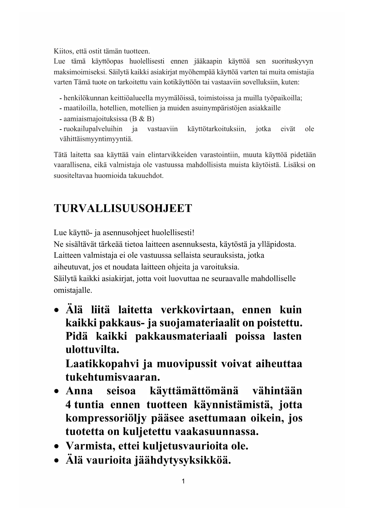 Kiitos, että ostit tämän tuotteen. Lue tämä käyttöopas huolellisesti ennen jääkaapin käyttöä sen suorituskyvyn maksimoimiseksi. Säilytä kaikki asiakirjat myöhempää käyttöä varten tai muita omistajia varten Tämä tuote on tarkoitettu vain kotikäyttöön tai vastaaviin sovelluksiin, kuten: - henkilökunnan keittiöalueella myymälöissä, toimistoissa ja muilla työpaikoilla; - maatiloilla, hotellien, motellien ja muiden asuinympäristöjen asiakkaille - aamiaismajoituksissa (B & B) - ruokailupalveluihin ja vastaaviin käyttötarkoituksiin, jotka eivät ole vähittäismyyntimyyntiä. Tätä laitetta saa käyttää vain elintarvikkeiden varastointiin, muuta käyttöä pidetään vaarallisena, eikä valmistaja ole vastuussa mahdollisista muista käytöistä. Lisäksi on suositeltavaa huomioida takuuehdot. TURVALLISUUSOHJEET Lue käyttö- ja asennusohjeet huolellisesti! Ne sisältävät tärkeää tietoa laitteen asennuksesta, käytöstä ja ylläpidosta. Laitteen valmistaja ei ole vastuussa sellaista seurauksista, jotka aiheutuvat, jos et noudata laitteen ohjeita ja varoituksia. Säilytä kaikki asiakirjat, jotta voit luovuttaa ne seuraavalle mahdolliselle omistajalle.