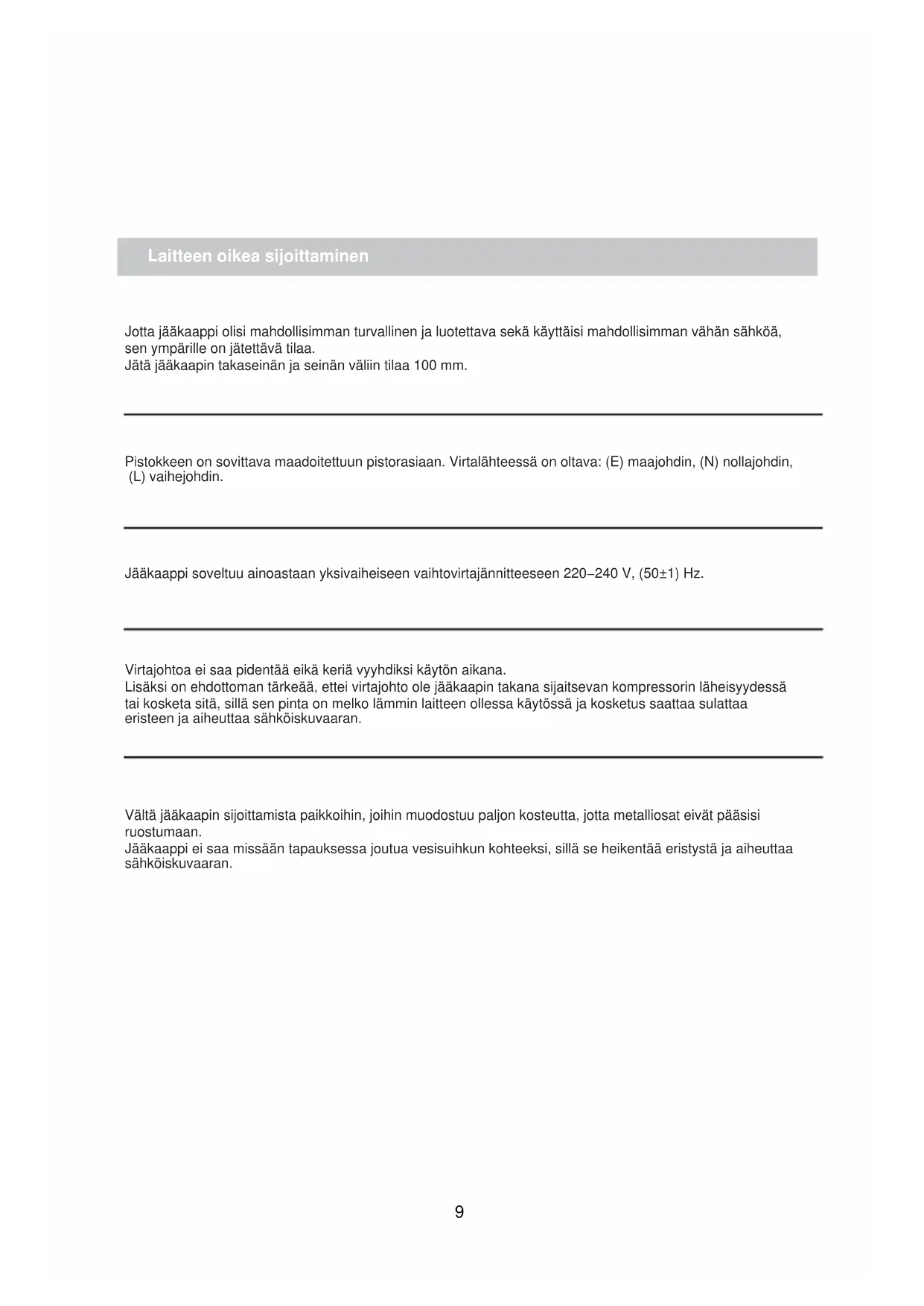 Jääkaappi soveltuu ainoastaan yksivaiheiseen vaihtovirtajännitteeseen 220−240 V, (50±1) Hz.
