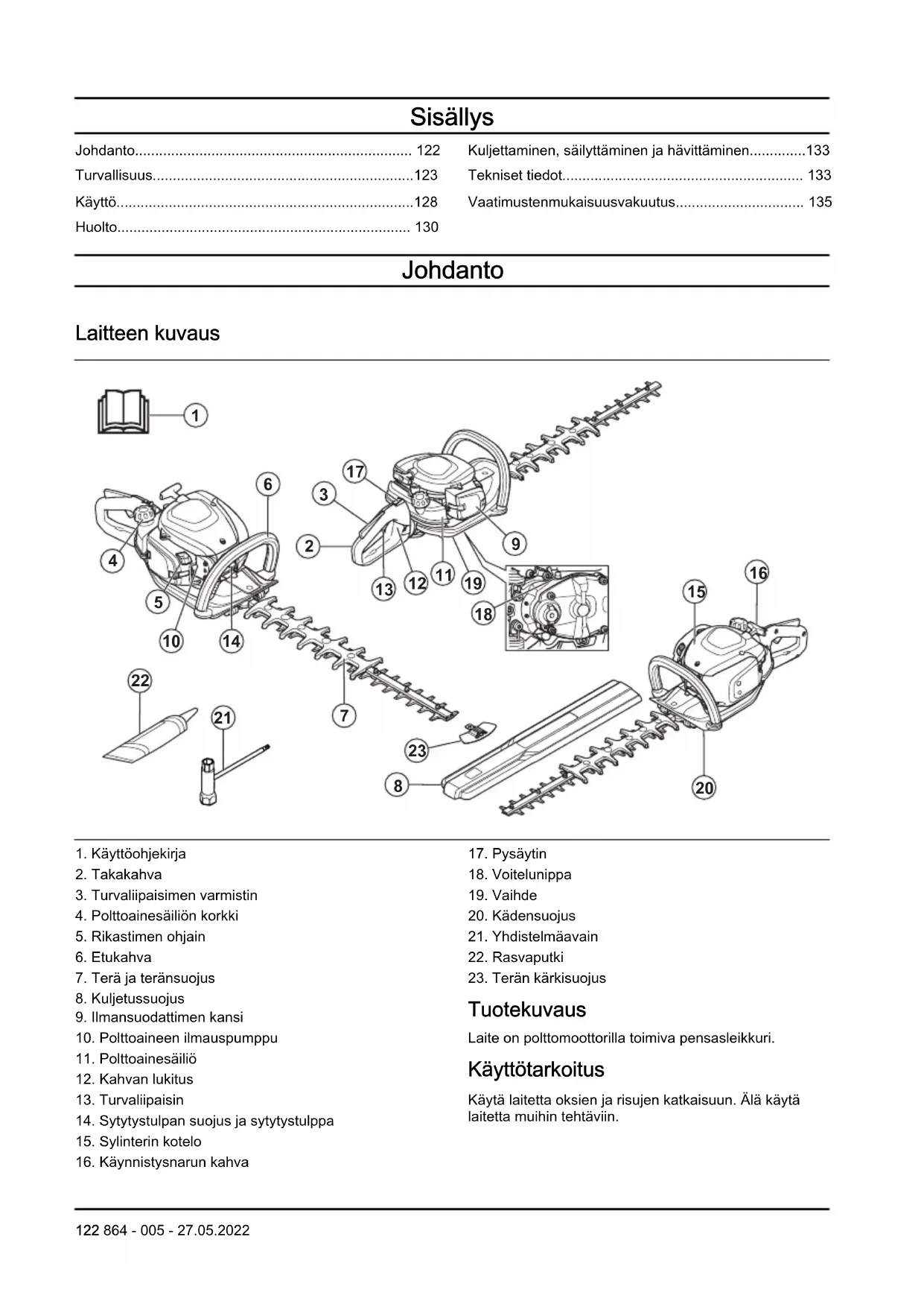 Tuotekuvaus Laite on polttomoottorilla toimiva pensasleikkuri. Käyttötarkoitus Käytä laitetta oksien ja risujen katkaisuun. Älä käytä laitetta muihin tehtäviin. 122 864 - 005 - 27.05.2022Laitteen symbolit Pysähdy. Ole varovainen ja käytä laitetta oikein. Tämä laite voi aiheuttaa käyttäjälle tai sivullisille vakavia vammoja tai kuoleman. Lue käyttöohje huolellisesti ja varmista, että ymmärrät sen sisällön, ennen kuin alat käyttää laitetta. Käytä hyväksyttyjä kuulonsuojaimia ja suojalaseja. Käytä hyväksyttyjä suojakäsineitä. Käytä kestäviä luistamattomia jalkineita. Joutokäynnin säätöruuvi. Suurkierrosneula. Matalakierrosneula. Melupäästöt ympäristöön eurooppalaisen direktiivin 2000/14/EY ja Uuden Etelä- Walesin lainsäädännön Protection of the Environment Operations (Noise Control) Regulation 2017 -asetuksen mukaisesti. Melupäästötiedot ilmoitetaan koneen arvokilvessä ja luvussa Tekniset tiedot. Laite täyttää voimassa olevien EY- direktiivien vaatimukset. Tämä tuote täyttää sovellettavien UK- säädösten vaatimukset. yyyywwxxxx Tyyppikilvessä näkyy sarjanumero, jossa yyyy on valmistusvuosi ja ww on valmistusviikko. Huomautus: Muita laitteen symboleita/tarroja tarvitaan joillakin markkina-alueilla ilmaisemaan sertifiointivaatimuksia. Euro V -päästöt VAROITUS: Moottorin muokkaaminen mitätöi tuotteen EU-tyyppihyväksynnän. Turvallisuus Turvallisuusmääritelmät Varoituksia, huomioita ja huomautuksia käytetään, kun jotakin käyttöohjeen osaa halutaan erityisesti korostaa. VAROITUS: Tätä käytetään, jos käyttöohjeen noudattamatta jättämisestä voi seurata käyttäjän tai sivullisen vamma tai kuolema. HUOMAUTUS: Tätä käytetään, jos käyttöohjeen noudattamatta jättämisestä voi seurata koneen, muiden materiaalien tai ympäristön vaurioituminen. Huomautus: Tätä käytetään tietyissä tilanteissa tarvittavien lisätietojen antamiseen. Yleiset turvaohjeet VAROITUS: Lue seuraavat varoitusohjeet ennen laitteen käyttämistä.